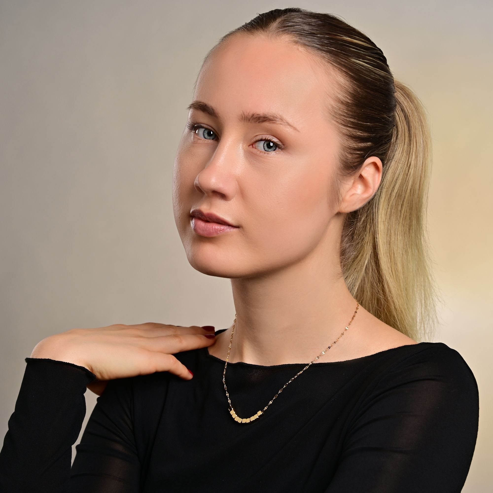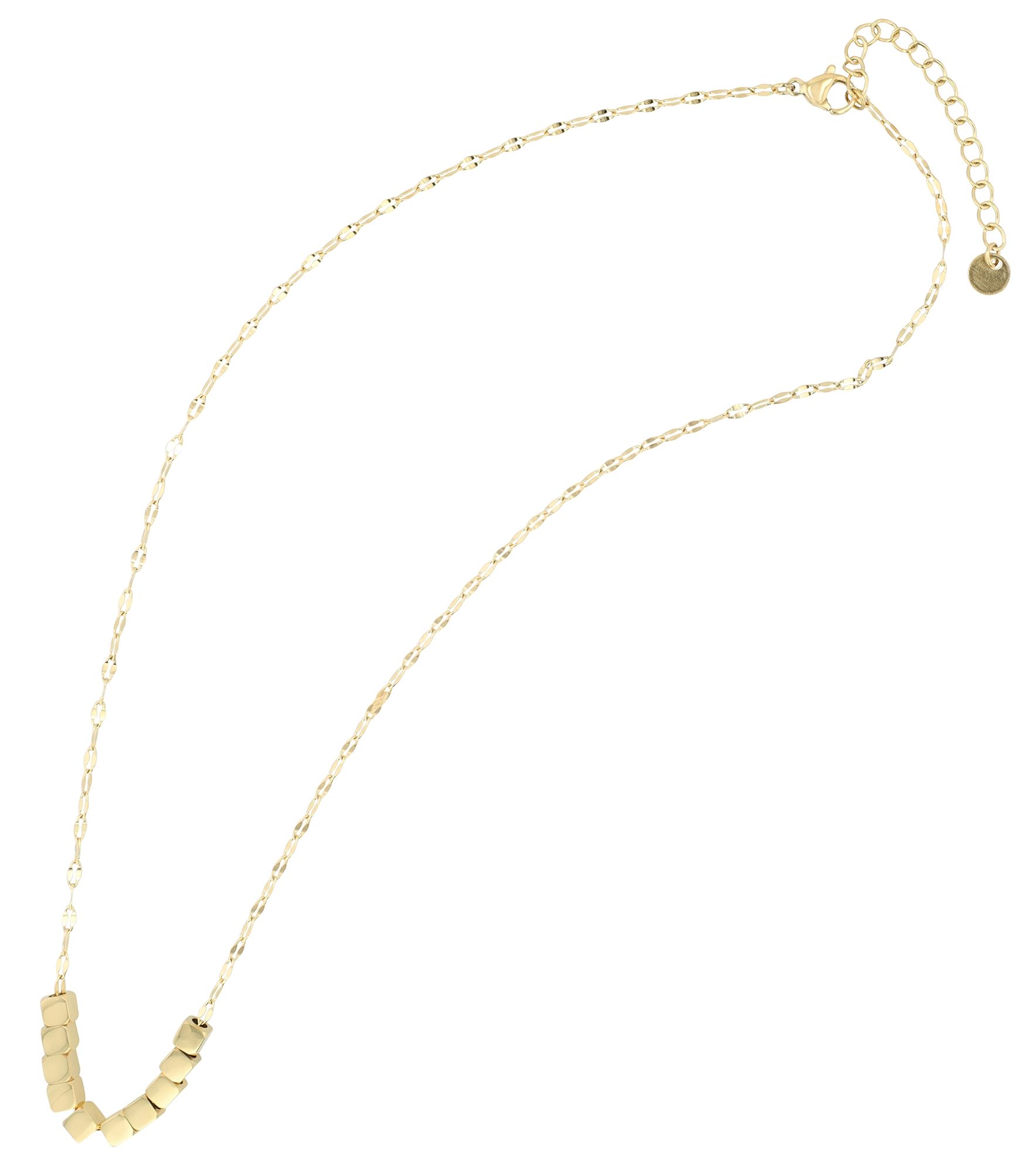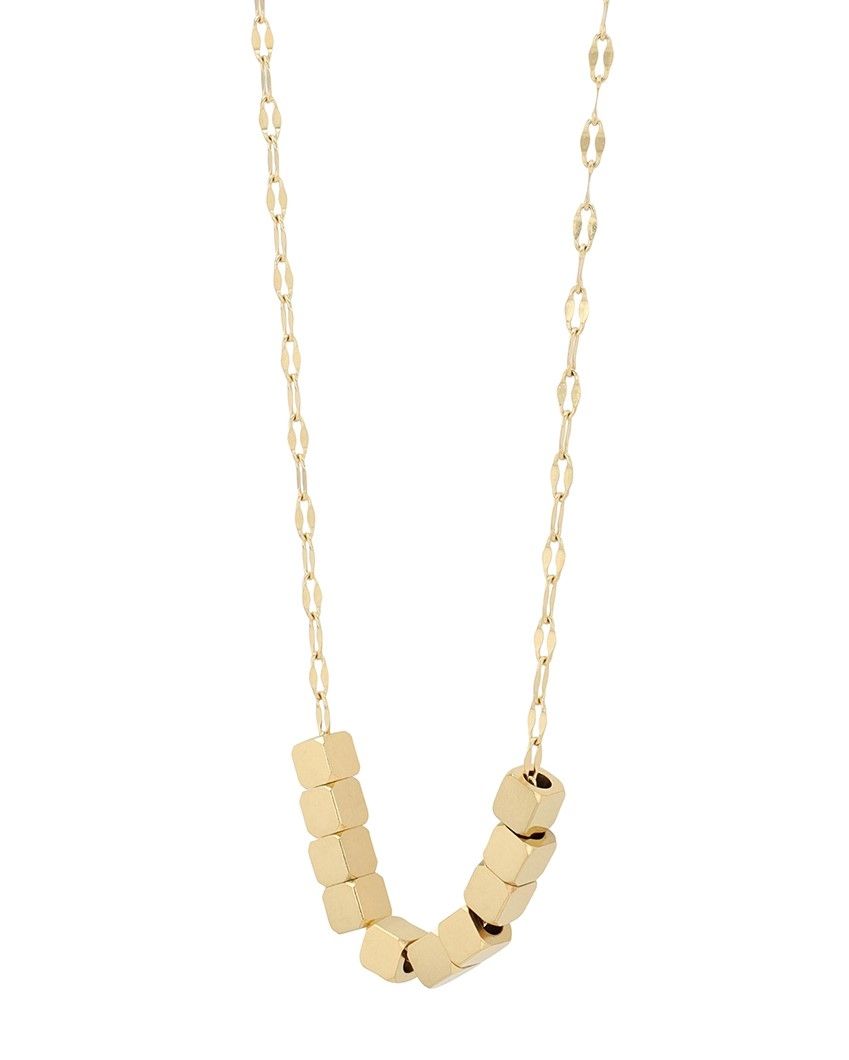 Het hoogtepunt van dit collier zijn de 10 stevig geregen hangers in een kubusvorm van 4 x 4 mm. Deze kleine details geven de ketting een subtiele maar opmerkelijke aanwezigheid en maken het tot een blikvanger.