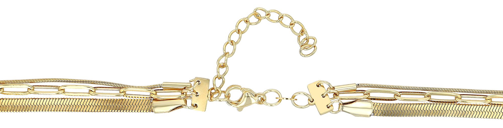 - 1. Kette, eine flache Schlangenkette (3 x 0,5 mm) in 40 cm Länge, die für eine fließende, glatte Optik sorgt.