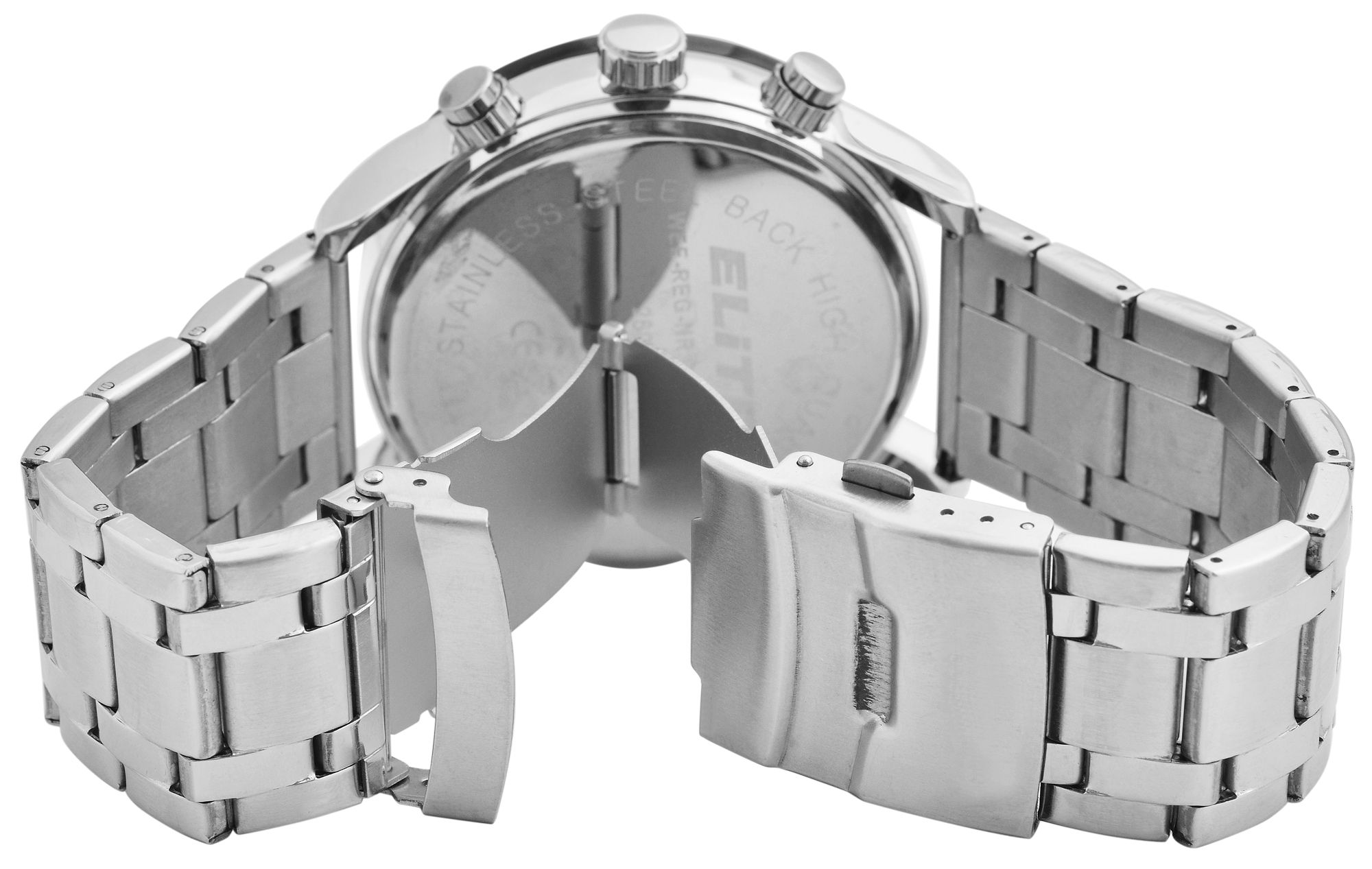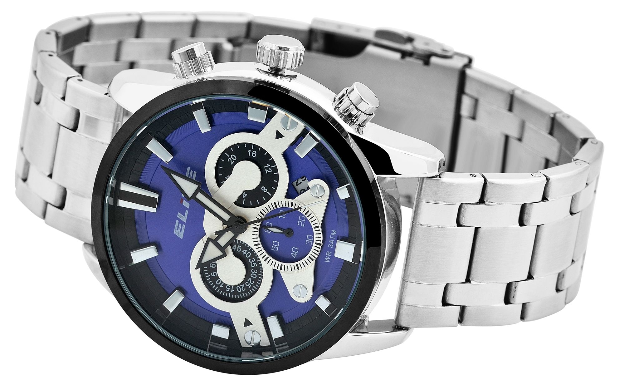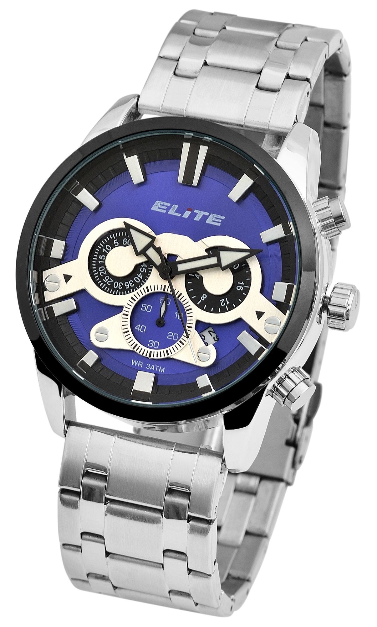 Elite Herren Chronograph mit Metallband, 3ATM, silberfarbig/ Blau