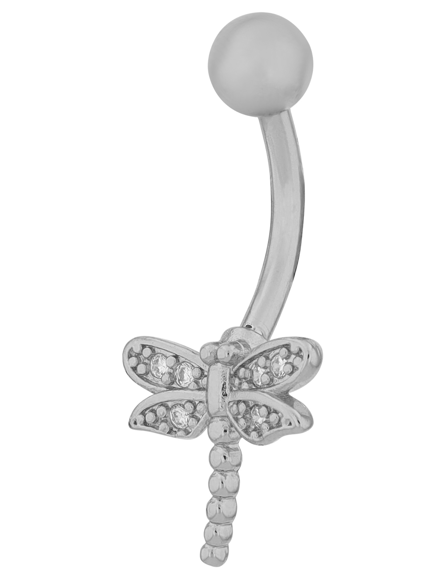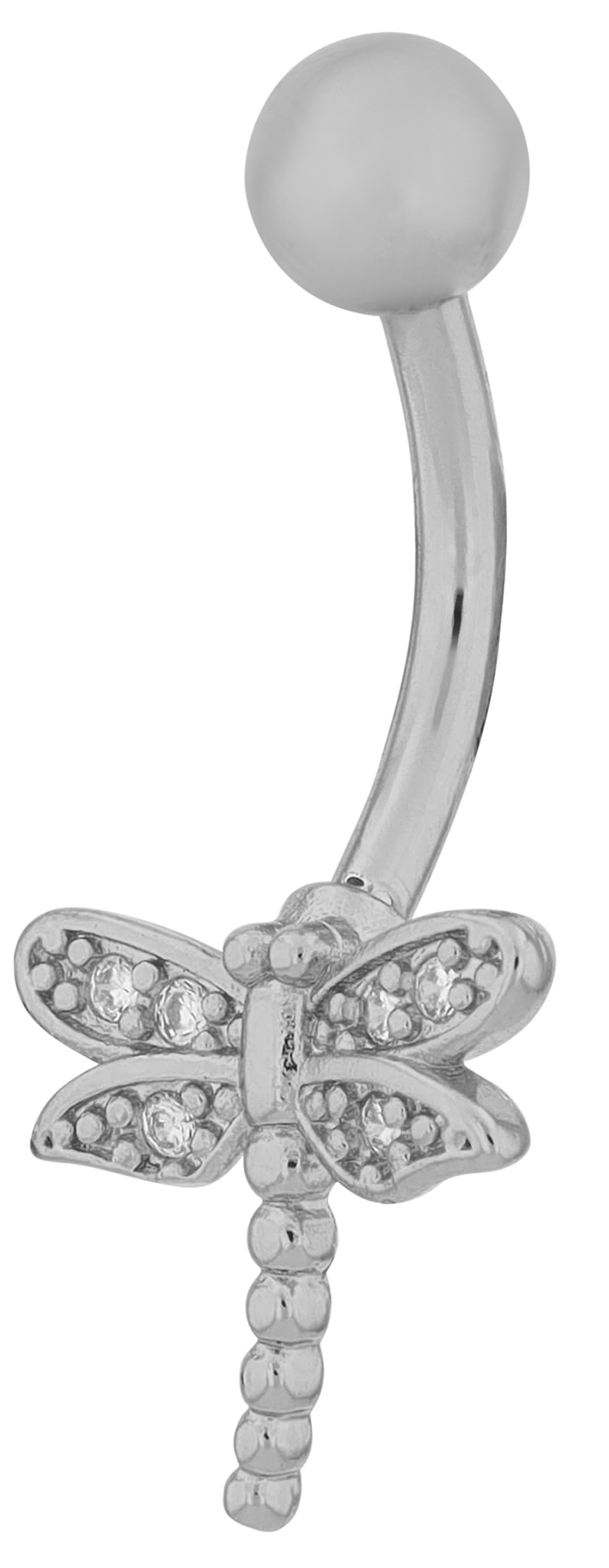 Productinformatie ""Emy" roestvrijstalen bronzen navelpiercing, lengte 12 mm/dikte 1,8 mm, libel, zirkonia, zilverkleurig"
