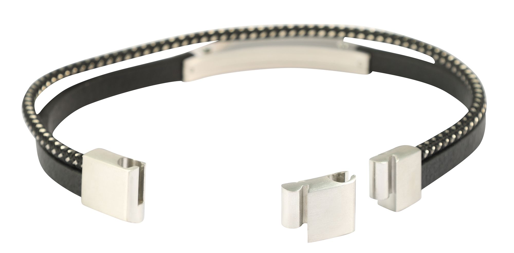 "Ennio" is een moderne armband van hoogwaardig imitatieleer met bijzondere details. De armband is verkrijgbaar in twee lengtes van 19 cm en 21 cm, beide lengtes hebben een extra verlengstuk van 1 cm dat eenvoudig aan de magnetische sluiting kan worden bevestigd. De armband bestaat uit twee strengen die perfect bij elkaar passen. De eerste streng is een massief koord in zwart met zilverkleurige details, de tweede streng is gemaakt van imitatieleer met een breedte van 6 mm en een roestvrijstalen element van 4,5 x 0,6 mm. Het roestvrijstalen element is versierd met een stijlvol patroon, maar biedt toch voldoende ruimte voor een persoonlijke gravure.