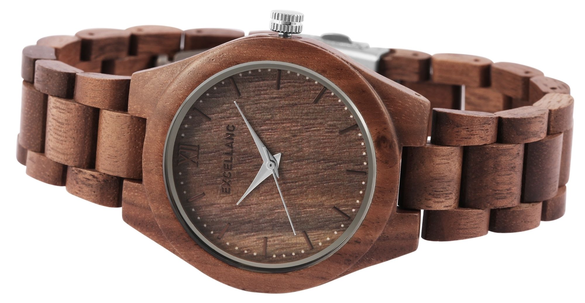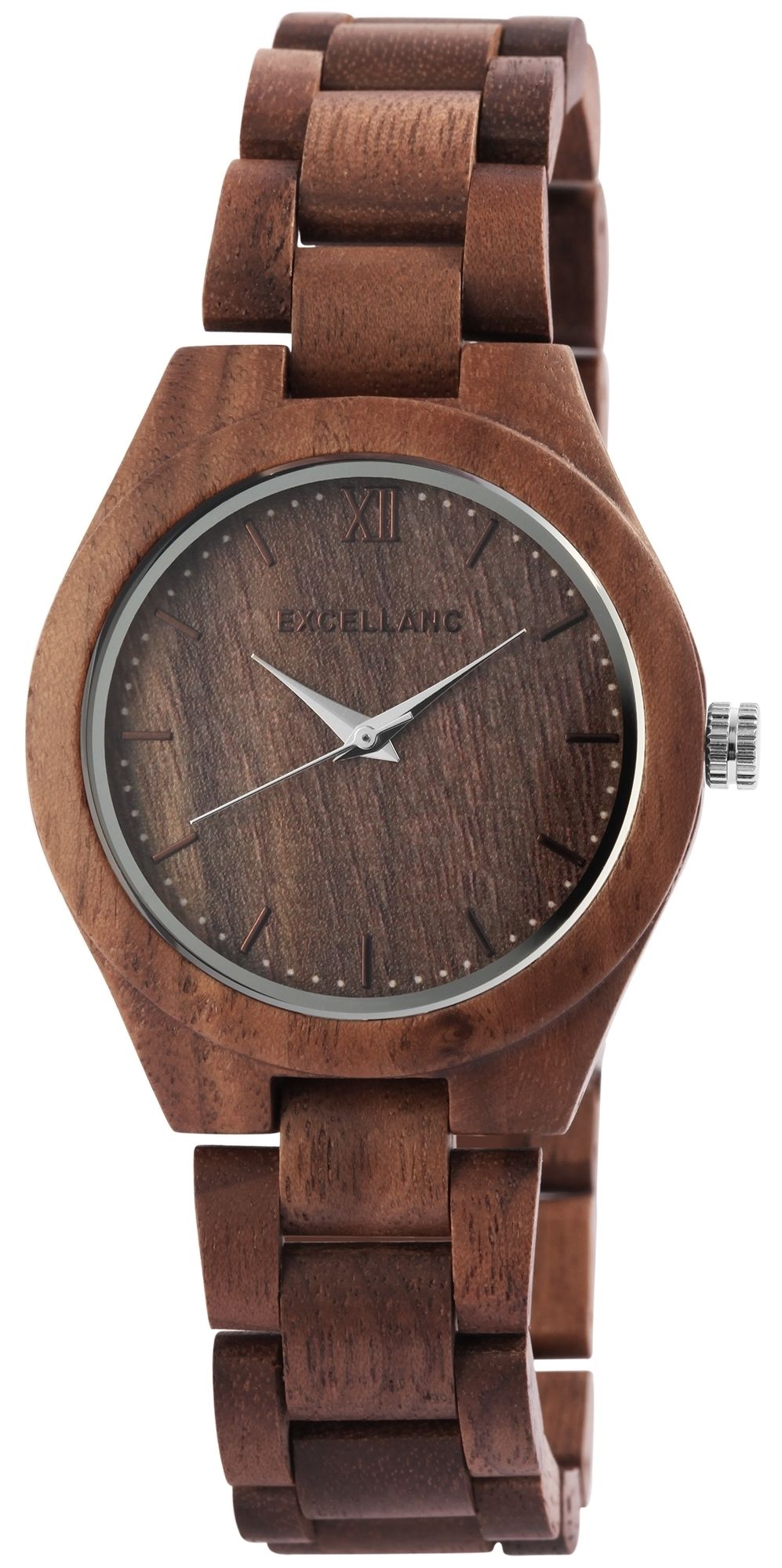 Het analoge damespolshorloge met 3 wijzers van het merk Excellanc heeft een hoogwaardig kwartsuurwerk. De houten band is 20 mm breed bij de lug en kan worden geopend en gesloten met een roestvrijstalen vouwsluiting. De totale lengte van het horloge is 22,5 cm, maar kan naar wens worden ingekort dankzij de afneembare elementen. De kast, ook van hout, met een houten achterkant in dezelfde kleur en mineraalglas, heeft een diameter van 40 mm en een kasthoogte van 11 mm. Een visueel hoogtepunt is het mineraalglas met een spiegelrand aan de buitenste rand. Samen met de kleurgecoördineerde kroon geeft dit het horloge een elegante uitstraling. De wijzerplaat is ook van hout. De wijzers en uurmarkeringen ronden het geheel harmonieus af. Elk houten horloge is uniek en individueel. Het is een statement van duurzaam denken en tegelijkertijd een modieus accessoire. De lichtheid van de natuurlijke grondstof zorgt voor een aangenaam draagcomfort, waardoor dit tijdloze horlogemodel onmisbaar is.