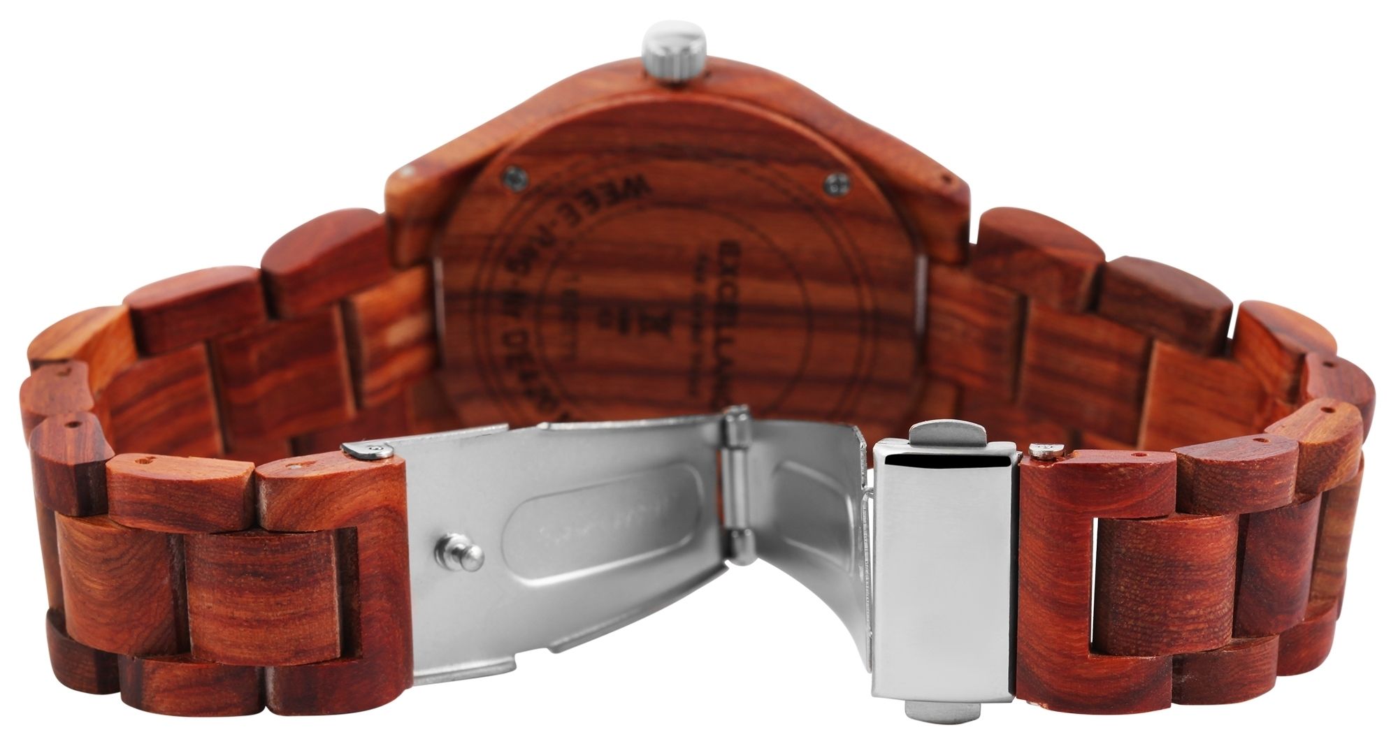 Het analoge damespolshorloge met 3 wijzers van het merk Excellanc heeft een hoogwaardig kwartsuurwerk. De houten band van sandelhout is 20 mm breed bij de lug en kan worden geopend en gesloten met een zilverkleurige roestvrijstalen vouwsluiting. De totale lengte van het horloge is 21 cm. De houten kast, ook gemaakt van sandelhout, met een houten achterkant in dezelfde kleur en mineraalglas, heeft een diameter van 40 mm en een kasthoogte van 11 mm. Een visueel hoogtepunt is het mineraalglas met een zilverkleurige spiegelrand aan de buitenrand. Samen met de zilverkleurige kroon geeft dit het horloge een elegante uitstraling. De wijzerplaat is ook gemaakt van sandelhout. De wijzers en uurmarkeringen zijn zilverkleurig en passen goed bij de algehele look van het horloge. Tegenwoordig zijn houten horloges een absolute must om elke pols. Het materiaal maakt het horloge niet alleen bijzonder duurzaam, maar ook een absolute blikvanger.