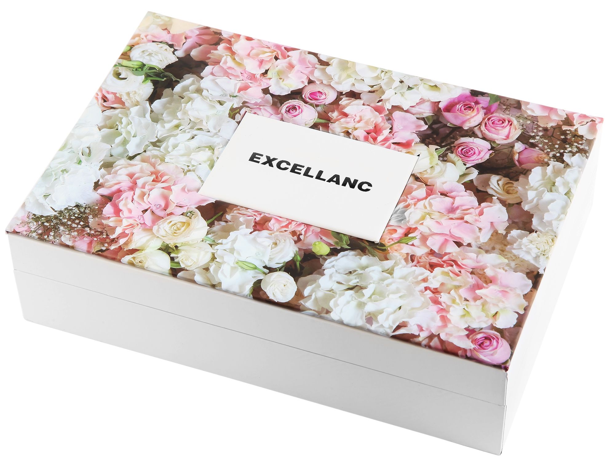De geschenkset van het merk Excellanc bestaat uit een damespolshorloge, een halsketting, een paar oorstekers en een vingerring. Alle sieraden zijn zilverkleurig en het horloge heeft een zwarte wijzerplaat. Het patroon van een bloem is terug te vinden in de hanger van het collier, de oorstekers en de vingerring en maakt de harmonieuze combinatie van alle sieraden, die worden geleverd in een praktisch scharnierdoosje, compleet. Het bloemcentrum van de ketting is versierd met 19 simili-stenen, de oorstekers zijn elk versierd met zeven simili-stenen en de ring heeft een grote simili-steen. Hij is ook versierd met nog eens 14 simili-stenen op de ringband. De ring heeft ook een open ringband zodat de maat kan worden aangepast. De lengte van de ketting in bolpatroon is 57 cm inclusief een verlengkettinkje van 5 cm. Dit maakt het mogelijk om de lengte te variëren en de moderne sieradenketting aan te passen aan elke outfit. Het polshorloge is een klassiek 3-hands horloge met een hoogwaardig quartz uurwerk. Het heeft een lengte van 18 cm, een kastdiameter van 38 mm en een kasthoogte van 9 mm. De geschenkdoos is 14,8 cm lang, 21,5 cm breed en 5,8 cm hoog.