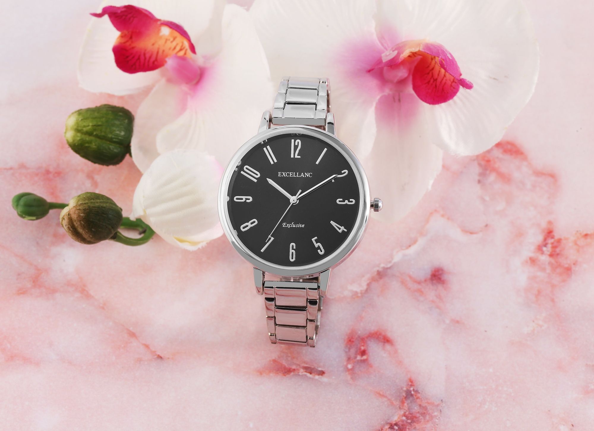 Productinformatie "Excellanc Damen Geschenkset mit Uhr, Halskette, Fingerring und Ohrsteckern, silberfarben/schwarz"