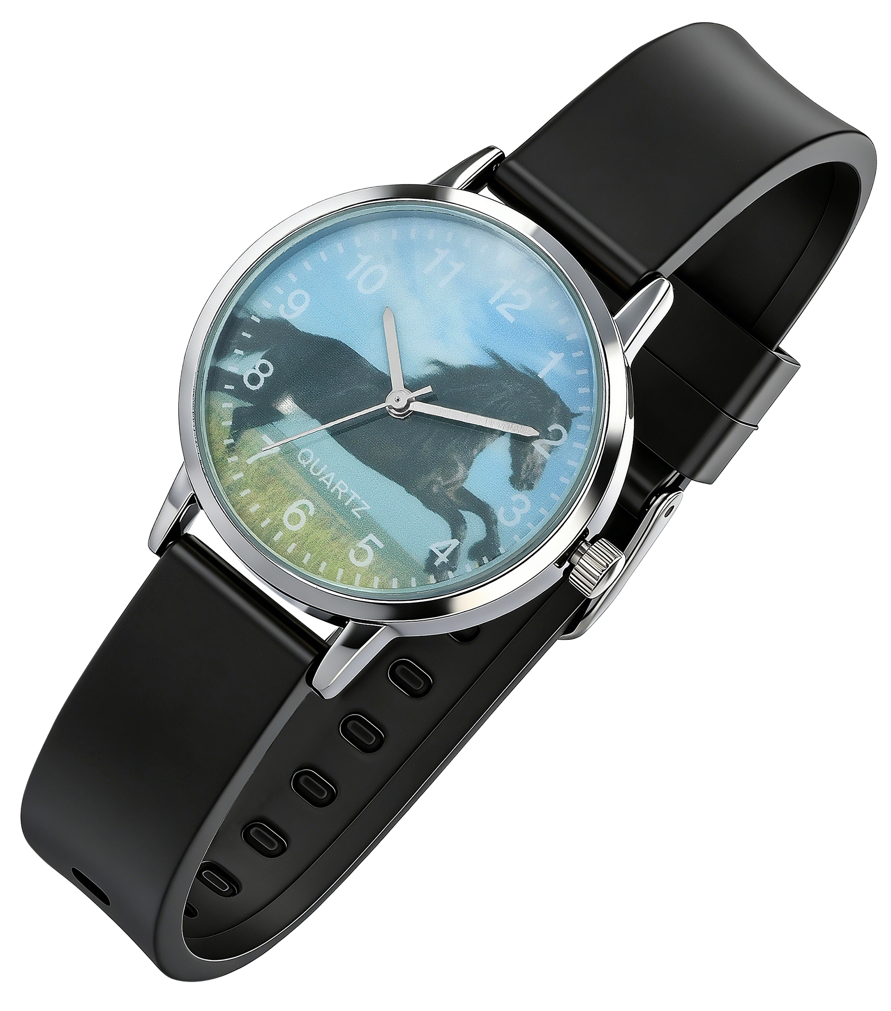 Productinformatie "Excellanc Damenuhr/ Jugenduhr "Pferd“ Ø 32 mm, schwarzes Silikonband"
