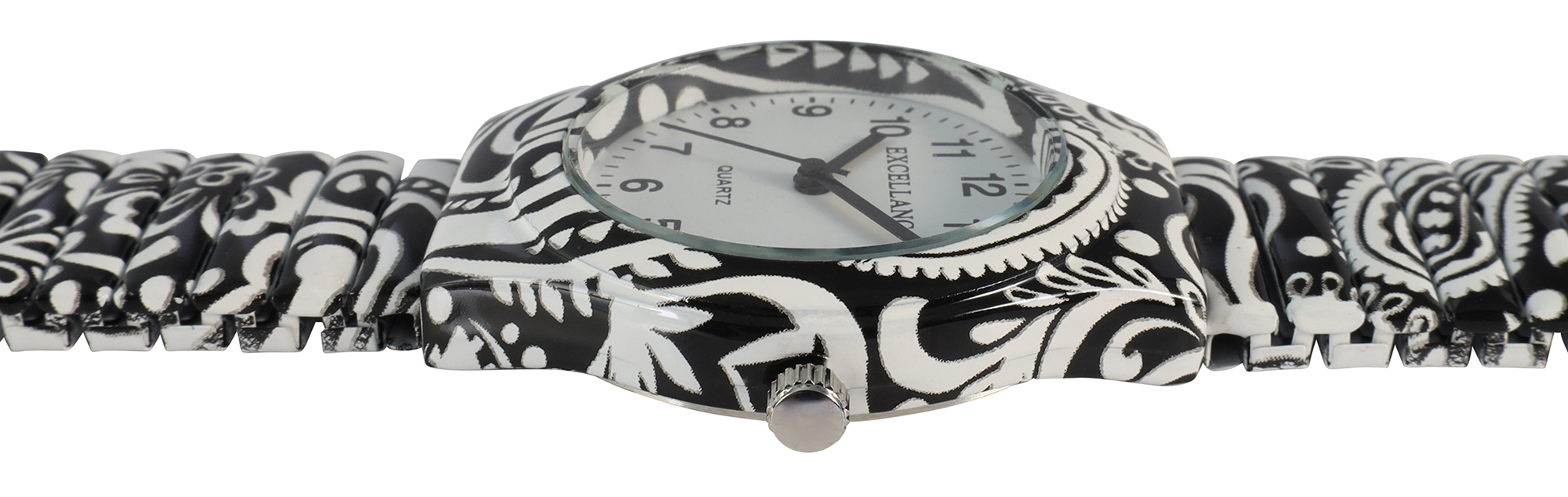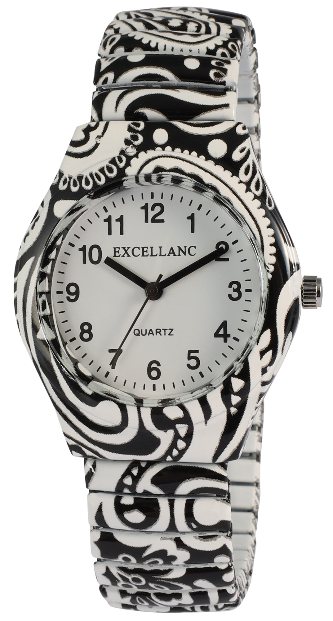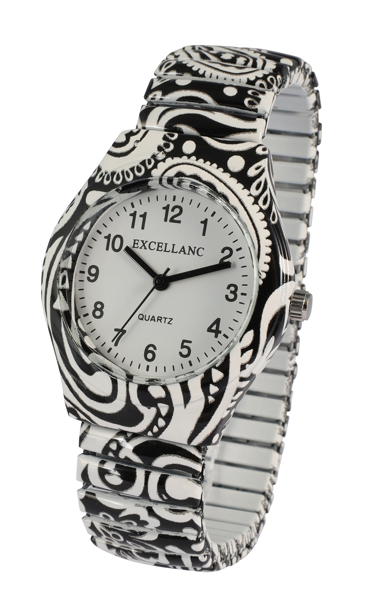 Dit Excellanc dameshorloge biedt een selectie bloemmotieven, vlindermotieven en abstracte patronen in verschillende kleuren, dus er is een model voor elke smaak en stijl. De elastische trekband kan individueel worden aangepast door elementen te verwijderen, waardoor een maximaal draagcomfort wordt gegarandeerd. Dit horloge is gemaakt van robuust metaal en combineert duurzaamheid met stijlvolle esthetiek.