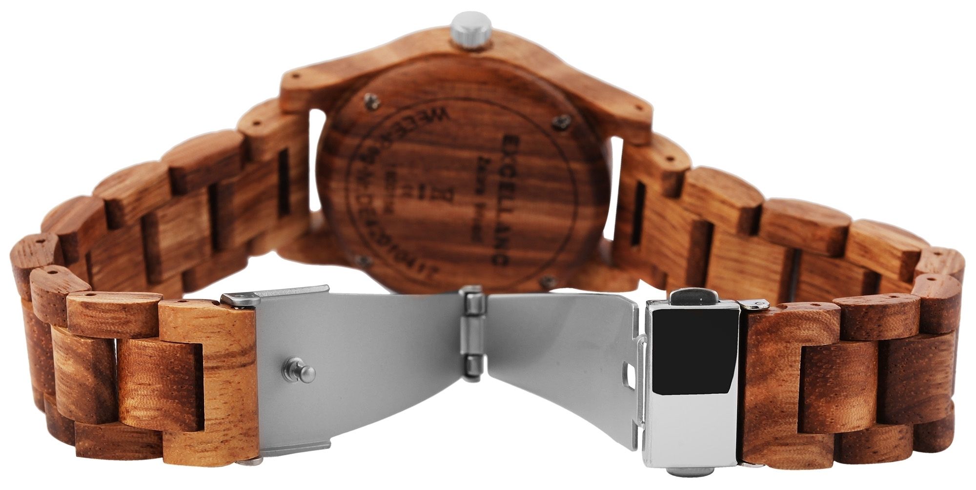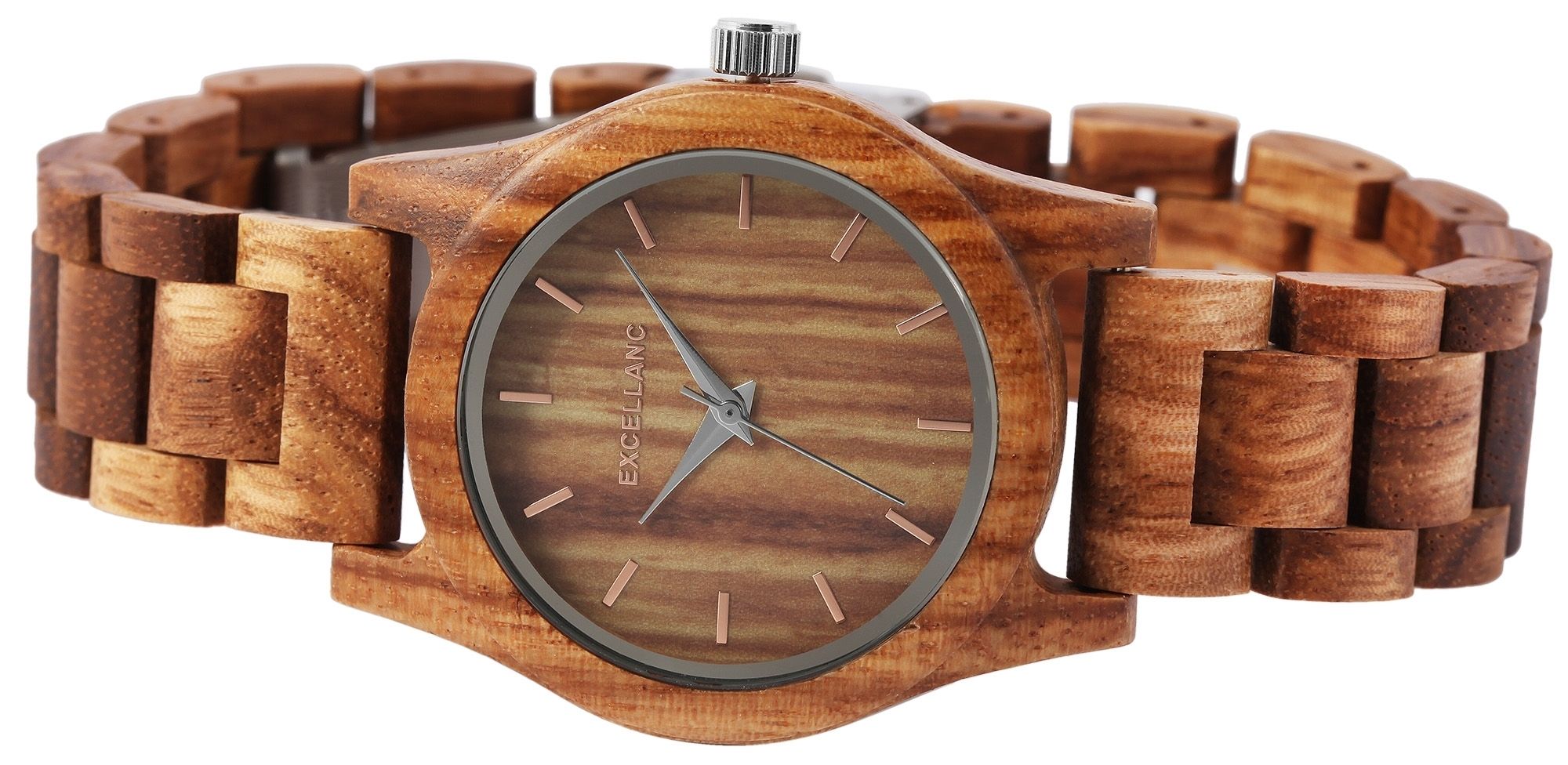 Het analoge damespolshorloge met 3 wijzers van het merk Excellanc heeft een hoogwaardig kwartsuurwerk. De zebrahouten band is 18 mm breed bij de lug en kan worden geopend en gesloten met een zilverkleurige roestvrijstalen vouwsluiting. De totale lengte van het horloge is 22,5 cm, maar kan naar wens worden ingekort dankzij de afneembare elementen. De kast, ook gemaakt van zebrahout, met een houten achterkant in dezelfde kleur en mineraalglas, heeft een diameter van 37 mm en een kasthoogte van 11 mm. Een visueel hoogtepunt is het mineraalglas met een zilverkleurige spiegelrand aan de buitenrand. Samen met de kleurgecoördineerde kroon geeft dit het horloge een elegante uitstraling. De wijzerplaat is ook van hout. De wijzers en uurmarkeringen passen bij de kleur en ronden het geheel harmonieus af. Elk houten horloge is uniek en individueel. Het is een statement van duurzaam denken en tegelijkertijd een modieus accessoire. De lichtheid van de natuurlijke grondstof zorgt voor een aangenaam draagcomfort, waardoor dit tijdloze horlogemodel onmisbaar is.