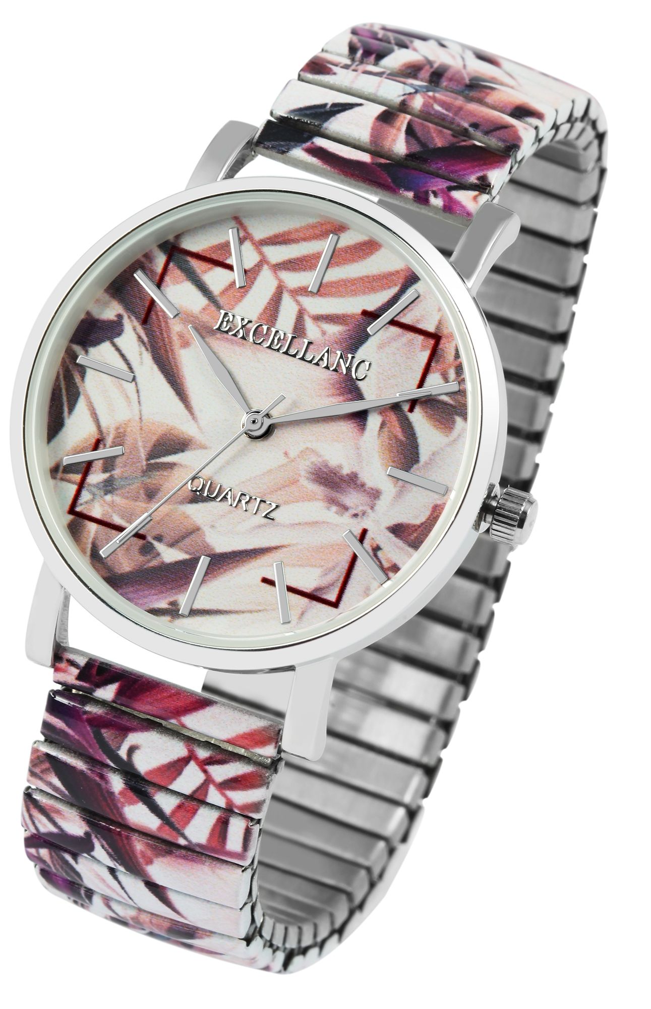 Het analoge 3-hands dameshorloge van het merk Excellanc heeft een hoogwaardig en nauwkeurig kwartsuurwerk. De roestvrijstalen trekband is 18 mm breed bij de lug en is bijzonder gemakkelijk over de pols te trekken dankzij de flexibele band. Het horloge is ook zeer comfortabel om te dragen dankzij de lichtheid en flexibiliteit. De totale lengte van het horloge is 19 cm. De lengte van de armband kan worden aangepast aan elke pols. De metalen kast met mineraalglas heeft een diameter van 36 mm en een kasthoogte van 8 mm. De achterkant van de kast is gemaakt van roestvrij staal. Elk horloge met trekband is een visueel hoogtepunt. Het kleurrijke patroon van de band wordt weerspiegeld in de wijzerplaat en maakt het horloge tot een allround blikvanger. De wijzers en indexen zijn monochroom en passen goed bij de algehele look van het horloge. Al met al is het een onmisbaar sieraad dat om geen enkele pols mag ontbreken.