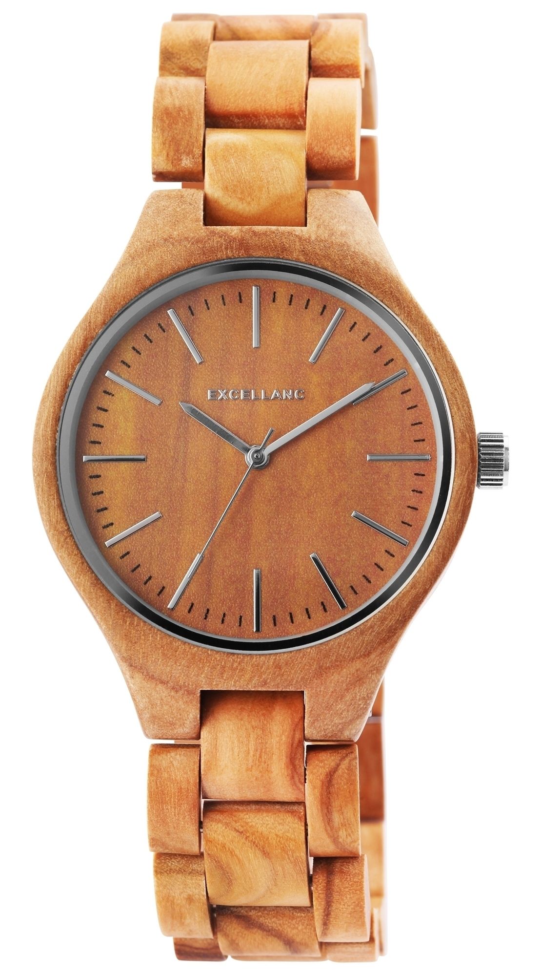 Het analoge herenpolshorloge met 3 wijzers van het merk Excellanc heeft een hoogwaardig kwartsuurwerk. De houten armband van olijfhout is 20 mm breed bij de lug en kan worden geopend en gesloten met een zilverkleurige roestvrijstalen vouwsluiting. De totale lengte van het horloge is 22,5 cm. De houten kast, ook gemaakt van olijfhout, met een houten achterkant in dezelfde kleur en mineraalglas, heeft een diameter van 41 mm en een kasthoogte van 10 mm. Een visueel hoogtepunt is het mineraalglas met een zilverkleurige spiegelrand aan de buitenrand. Samen met de zilverkleurige kroon geeft dit het horloge een elegante uitstraling. De wijzerplaat is ook gemaakt van olijfhout. De wijzers en uurmarkeringen zijn zilverkleurig en passen goed bij de algehele look van het horloge. Tegenwoordig zijn houten horloges een absolute must om elke pols. Dankzij het materiaal is het horloge niet alleen bijzonder duurzaam, maar ook een absolute blikvanger.
