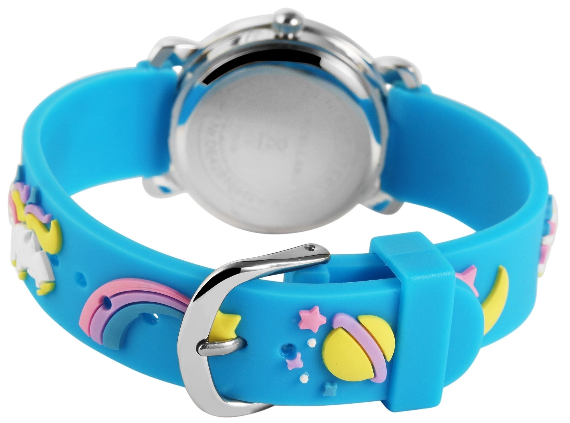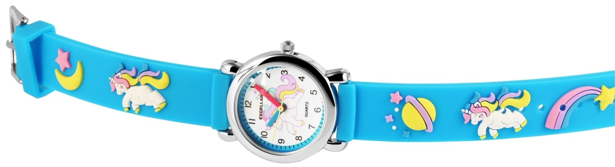 Het analoge 3-hands kinderpolshorloge van het merk Excellanc heeft een hoogwaardig PC21 kwartsuurwerk. De siliconen band is 14 mm breed bij de lug en kan worden geopend en gesloten met een gesp. De totale lengte van het horloge is 20 cm. De metalen kast met mineraalglas heeft een diameter van 27 mm en een kasthoogte van 10 mm. De achterkant van de kast is gemaakt van roestvrij staal. De kleurrijke rubberen band is versierd met twee grote eenhoorns en verschillende motieven uit het zonnestelsel en is comfortabel om te dragen. De wijzerplaat is wit en bedrukt met zwarte cijfers en indexen. Er staat ook een groot eenhoornmotief op de wijzerplaat. De uurwijzer is blauw, de minutenwijzer is rood en de secondewijzer is geel. Dit maakt het gemakkelijker om de tijd te leren en af te lezen.