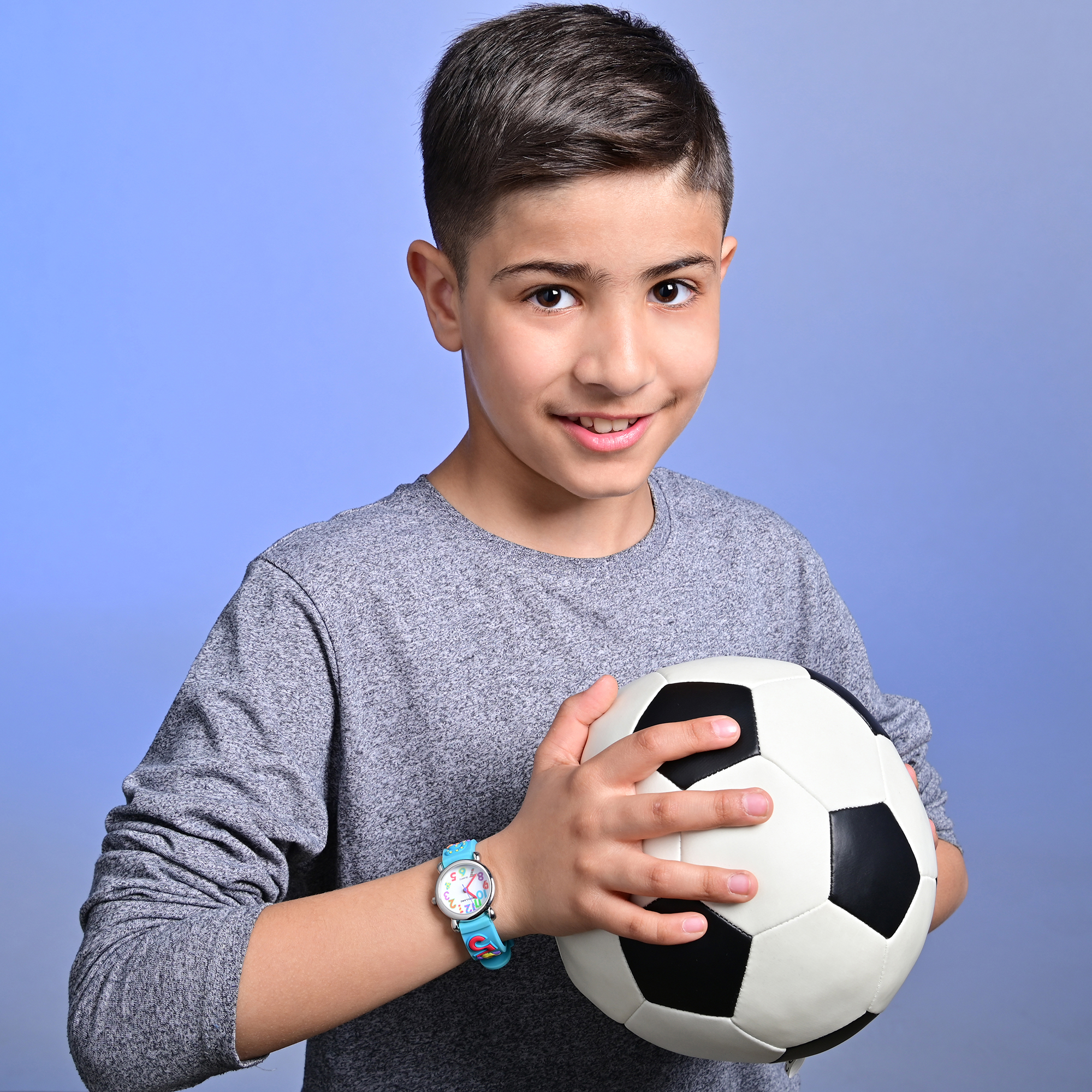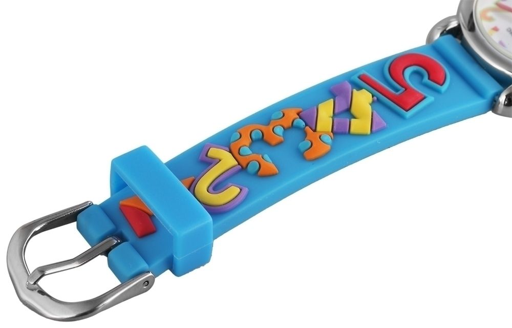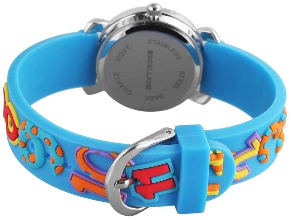 Het analoge 3-hands kinderpolshorloge van het merk Excellanc heeft een hoogwaardig PC21 kwartsuurwerk. De lichtblauwe siliconen band is 14 mm breed bij de lug en kan worden geopend en gesloten met een zilverkleurige gesp. De totale lengte van het horloge is 20 cm. De zilverkleurige metalen kast met mineraalglas heeft een diameter van 27 mm en een kasthoogte van 10 mm. De achterkant van de kast is gemaakt van roestvrij staal. De kleurrijke rubberen band zorgt voor draagcomfort. De cijfers van één tot twaalf zijn erop te vinden en zorgen voor een mooie verbinding met de wijzerplaat. Deze is wit en bedrukt met twaalf kleurrijke cijfers. De uur- en minutenwijzers zijn ook rood en de secondewijzer is paars.