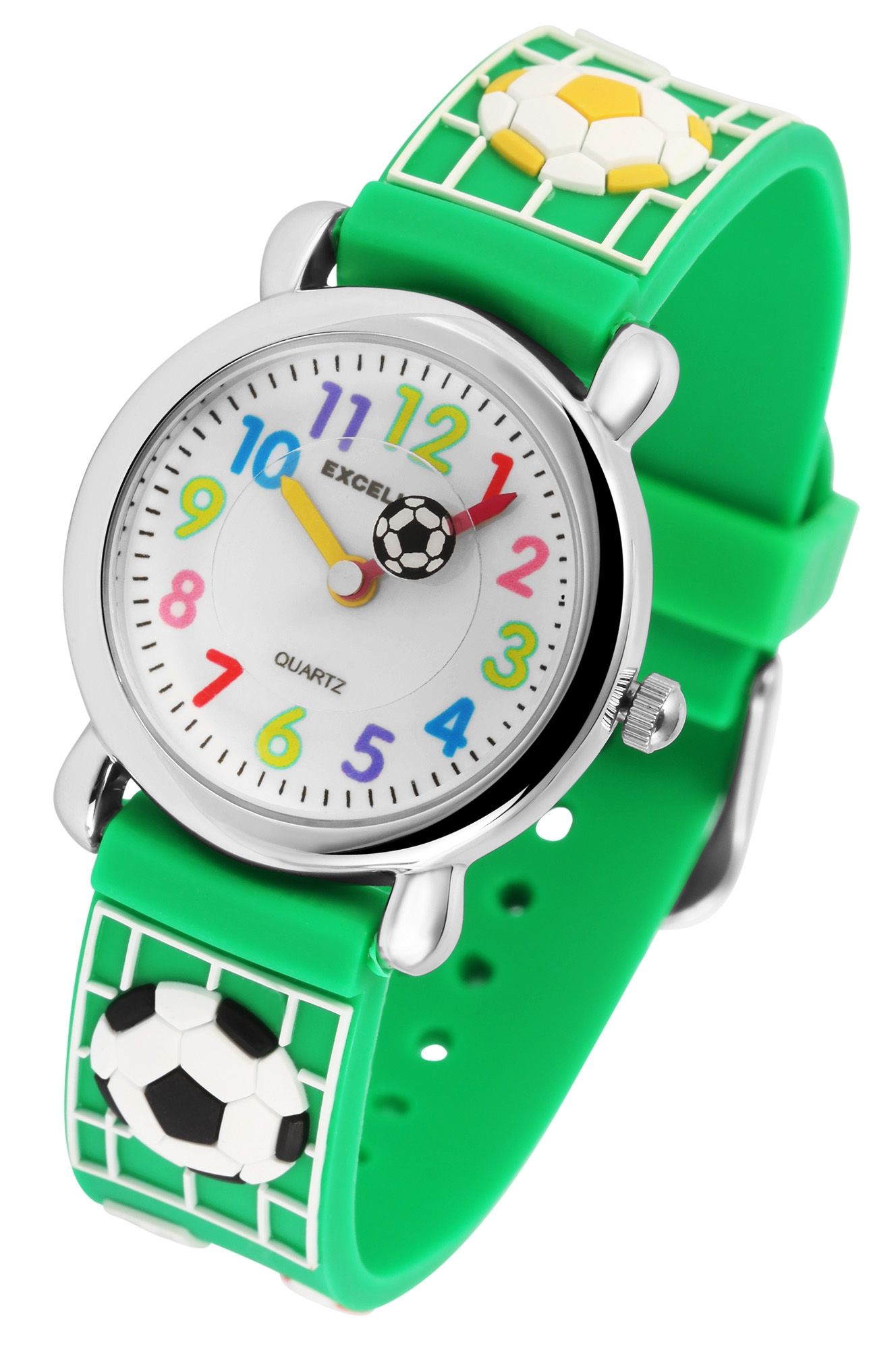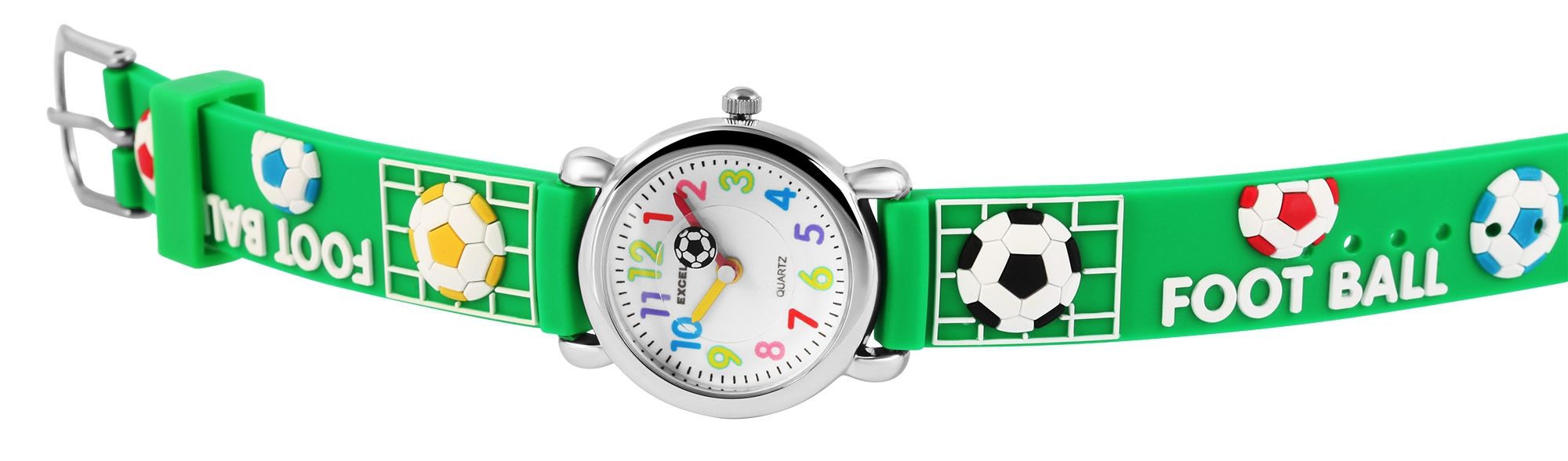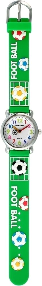 Het analoge 3-handige kinderhorloge van het merk Excellanc heeft een hoogwaardig PC21 kwartsuurwerk. De siliconen band is 14 mm breed en opent met een gesp. De totale lengte is 20 cm. De metalen kast met mineraalglas heeft een diameter van 27 mm en een kasthoogte van 10 mm. De kastdeksel is gemaakt van roestvrij staal. De wijzers zijn rood en geel van kleur, die zorgen voor een goed contrast op de witte wijzerplaat, waardoor het gemakkelijk is om de tijd af te lezen op polshorloges. Het hoogtepunt is het voetbalmotief dat zowel de siliconen band als de secondewijzer van het kinderhorloge siert.