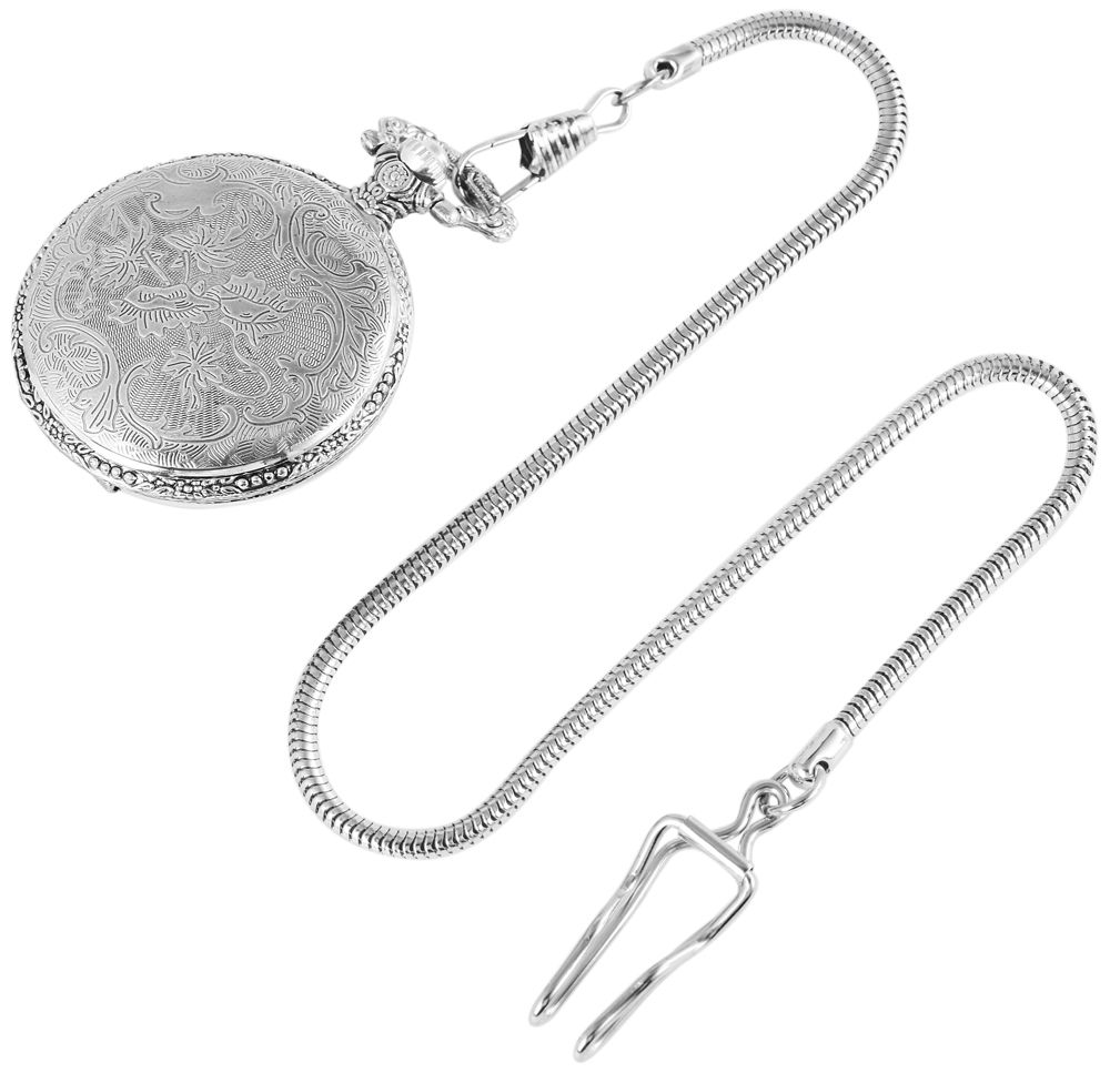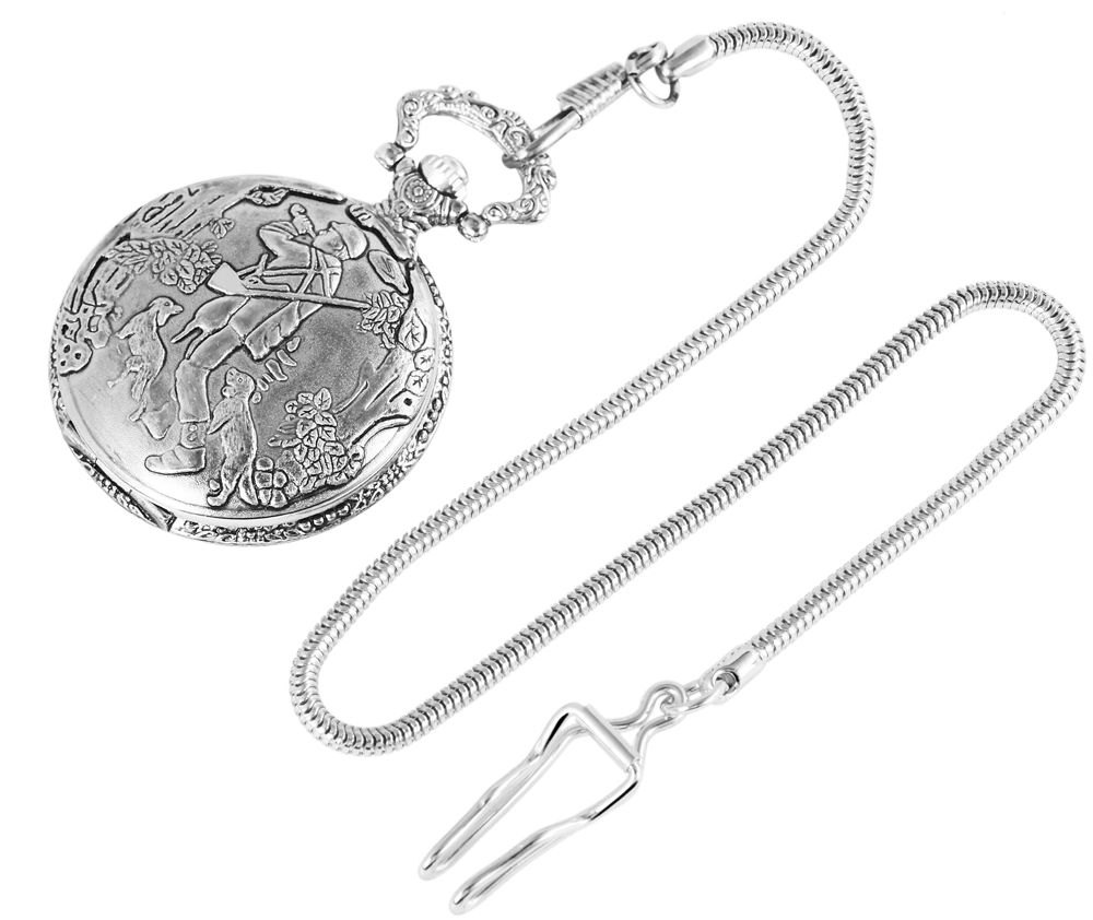 Het analoge 3-hands zakhorloge van het merk Excellanc heeft een hoogwaardig kwartsuurwerk. De ronde zilverkleurige metalen kast is aan de achterkant versierd met een bloemenpatroon. Op de voorkant staat een jager afgebeeld die op jacht is met twee honden. Het klassieke zakhorloge kan worden geopend met een drukknop die is geïntegreerd in de kroon. Een 30 cm lange zakhorlogeketting met slangenpatroon is aan het zakhorloge bevestigd, zodat het veilig aan een tas of kledingstuk kan worden bevestigd. De wijzerplaat is wit en heeft grote zwarte Arabische cijfers. Deze benadrukken het klassieke uiterlijk van het zakhorloge en maken het bijzonder gemakkelijk om de tijd af te lezen. Het horloge is ook voorzien van een licht gewelfd plastic kristal. Het horloge heeft een diameter van 47 mm en een kasthoogte van 16 mm.