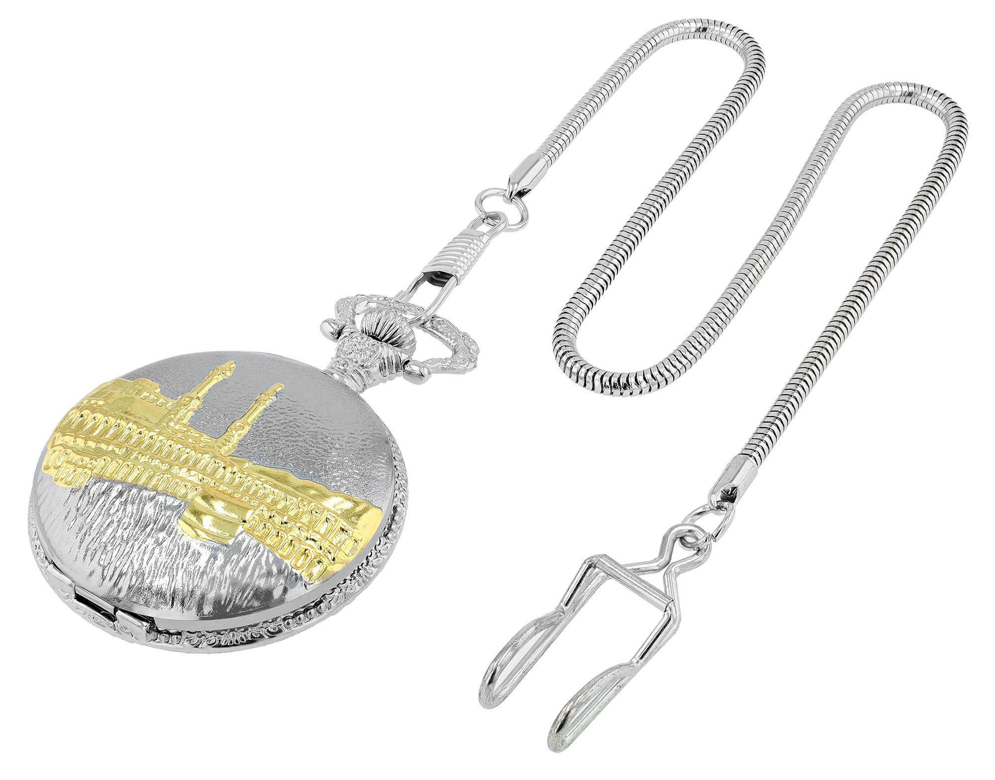 De kast van het zakhorloge is zilverkleurig en gemaakt van robuust metaal. De voorkant is versierd met een gedetailleerd Mekka-motief in goudkleur. In het horloge zit een nauwkeurig PC 21 quartz uurwerk. De wijzerplaat heeft een klassieke witte kleur en is heel gemakkelijk af te lezen met de zwarte Arabische cijfers. Het horloge heeft een royale diameter van 46 mm. Het zakhorloge zit aan een afneembare ketting van 34 cm. Aan het einde van deze ketting zit een praktische clip waarmee je het horloge gemakkelijk en stevig aan je broek, vest of jasje kunt bevestigen.