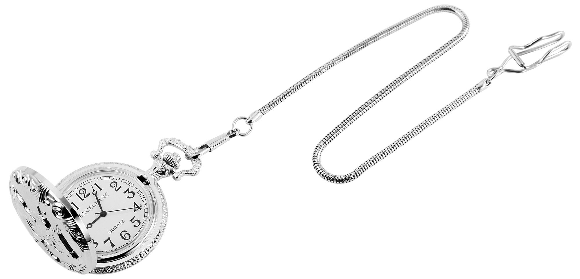 Het analoge 3-hands zakhorloge van het merk Excellanc heeft een hoogwaardig kwartsuurwerk. De ronde zilverkleurige metalen kast is aan de achterkant versierd met een bloemenpatroon. De matte voorkant is versierd met 3 paarden in het midden. Het klassieke zakhorloge kan worden geopend met een drukknop die is geïntegreerd in de kroon. Aan het zakhorloge zit een 30 cm lange zakhorlogeketting met slangenpatroon waarmee het stevig aan een tas of kledingstuk kan worden bevestigd. De wijzerplaat is wit en heeft grote zwarte Arabische cijfers. Deze benadrukken het klassieke uiterlijk van het zakhorloge en maken het bijzonder gemakkelijk om de tijd af te lezen. Het horloge is ook voorzien van een licht gewelfd plastic kristal. Het horloge heeft een diameter van 47 mm en een kasthoogte van 16 mm.