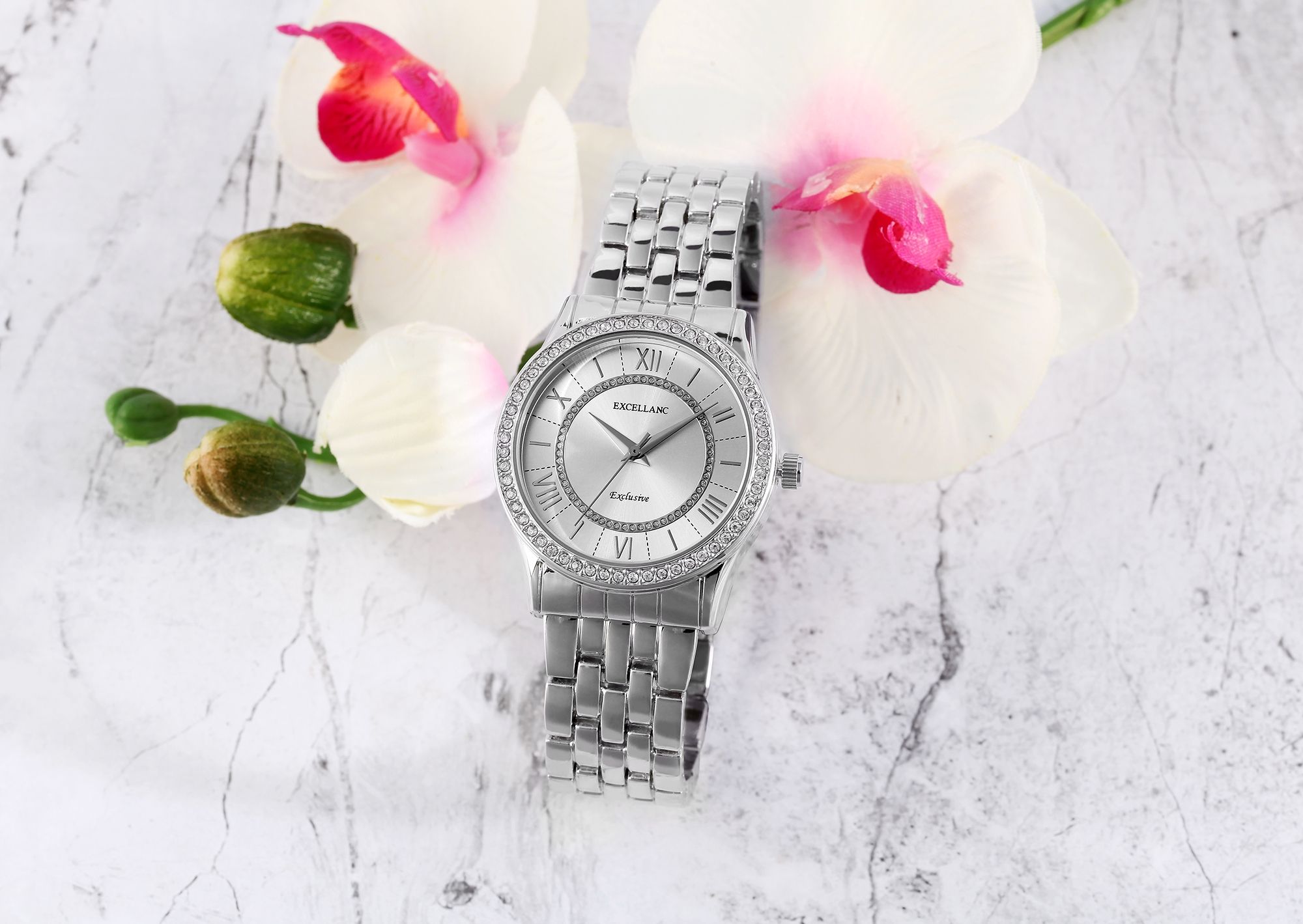 Productinformatie "Excellanc dames geschenkset met horloge, ketting, ring en oorbellen, zilverkleurig/wit"