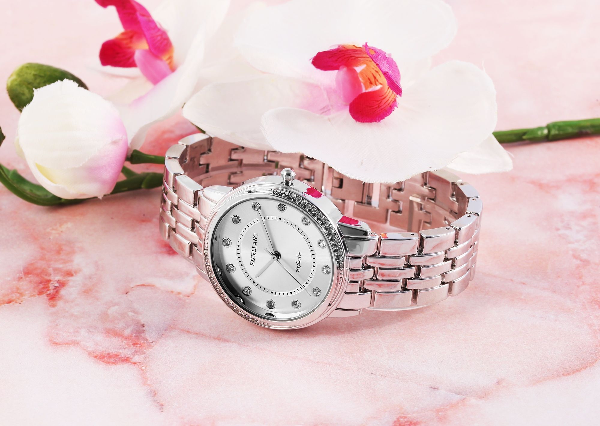 De cadeauset van het merk Excellanc bestaat uit een polshorloge, een armband en een armband. De sieraden zijn qua kleur op elkaar afgestemd en kunnen perfect samen worden gedragen. Het analoge damespolshorloge met 3 wijzers heeft een quartz-uurwerk van hoge kwaliteit en is versierd met 30 simili-stenen op de lunette. De metalen armband is 16 mm breed bij de lug en kan worden geopend en gesloten met een clipsluiting. De totale lengte van het horloge is 20 cm. De metalen kast met mineraalglas heeft een diameter van 36 mm en een kasthoogte van 9 mm. De achterkant van de kast is gemaakt van roestvrij staal. De wijzers en indexen hebben dezelfde kleur en passen goed bij de algehele look van het horloge. De armband, die gemaakt is in een harnaspatroon, kan worden ingekort en is 20,5 cm lang. De armband heeft een diameter van 57 mm en kan worden geopend en gesloten met een praktische haaksluiting. Hij is ook versierd met 60 similli stenen, waardoor hij een absolute blikvanger is. De damesset is een allround blikvanger voor om de pols en een fantastisch cadeau. Bijvoorbeeld voor Moederdag, verjaardagen, jubilea of Kerstmis. De accessoires worden geleverd in een hoogwaardige geschenkverpakking van 10,8 cm lang, 16,5 cm breed en 7 cm diep.