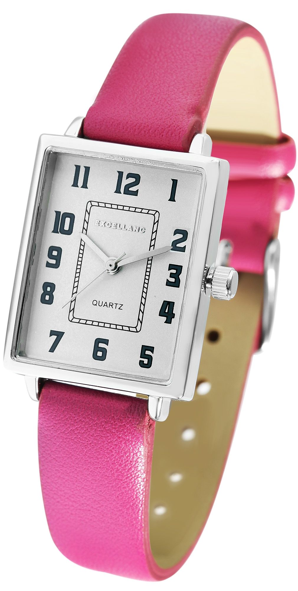 Het analoge damespolshorloge met 3 wijzers van het merk Excellanc heeft een hoogwaardig en nauwkeurig kwartsuurwerk. De band van imitatieleer is 14 mm breed bij de lug en kan worden geopend en gesloten met een gesp. De horlogeband is comfortabel om te dragen en zit goed om je pols. De totale lengte van het horloge is 23,5 cm. De vierkante metalen kast met mineraalglas meet 30 x 24 mm en heeft een kasthoogte van 8 mm. De tijd is gemakkelijk af te lezen dankzij de duidelijke wijzerplaat met Arabische cijfers. Het dameshorloge maakt indruk met zijn klassieke ontwerp en kan zowel als alledaags horloge als bij een zakelijke outfit worden gedragen. De glanzende afwerking van de horlogekast in combinatie met de band benadrukt het mooie design van dit klassieke uurwerk.