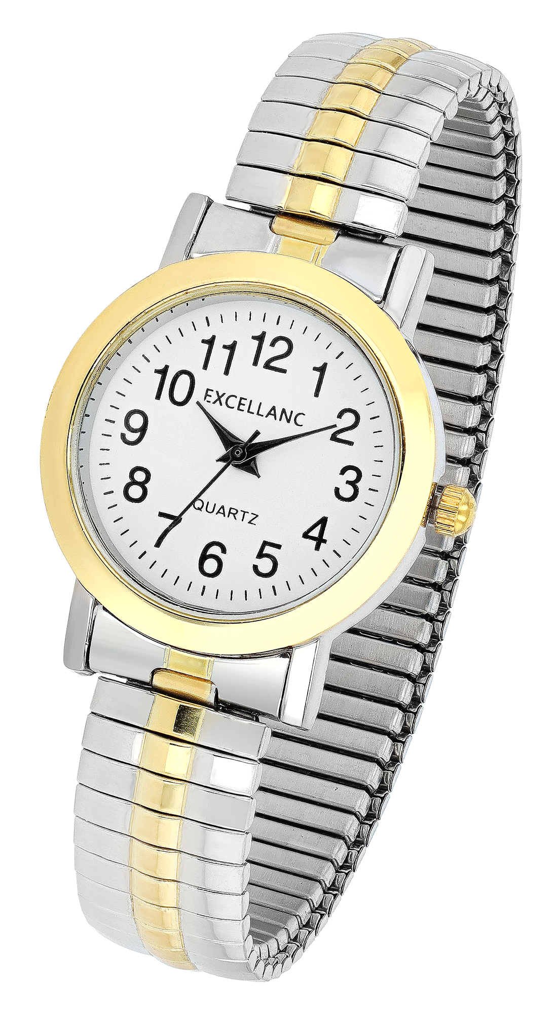 Het analoge damespolshorloge met 3 wijzers van het merk Excellanc heeft een hoogwaardig kwartsuurwerk. De zilvergoudkleurige roestvrijstalen trekband is 13 mm breed bij de lug en is bijzonder comfortabel en gemakkelijk over de pols te trekken dankzij de flexibele band. De totale lengte van het horloge is 19 cm. De tweekleurige metalen kast met mineraalglas heeft een diameter van 28 mm en een kasthoogte van 7,5 mm. De achterkant van de kast is gemaakt van roestvrij staal. Dankzij de effen witte wijzerplaat, de zwarte wijzers en indexen en de duidelijke lay-out is de tijd in één oogopslag snel af te lezen. Dit tijdloze horlogemodel is een echte klassieker en daarom ideaal als cadeau voor een geliefde.