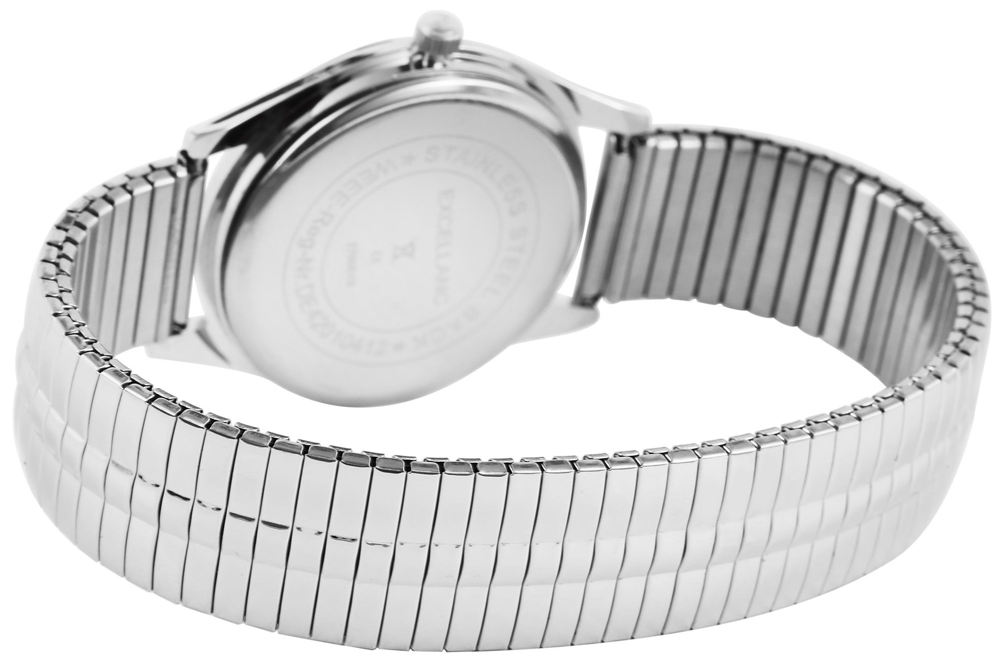 Het zilverkleurige analoge herenhorloge met 3 wijzers en trekband van het merk Excellanc heeft een hoogwaardig kwartsuurwerk. De roestvrijstalen trekband is 18 mm breed bij de lug en is bijzonder gemakkelijk over de pols te trekken dankzij de flexibele band. Dankzij de flexibiliteit en lichtheid is het horloge zeer comfortabel om te dragen. Het herenhorloge heeft een totale lengte van 22,5 cm. De lengte van de armband kan worden aangepast aan elke pols. De metalen kast met mineraalglas heeft een diameter van 36 mm en een kasthoogte van 8 mm. De achterkant van de kast is gemaakt van roestvrij staal. Met zijn eenvoudige, elegante look kan dit horloge gemakkelijk worden gecombineerd met elke outfit.