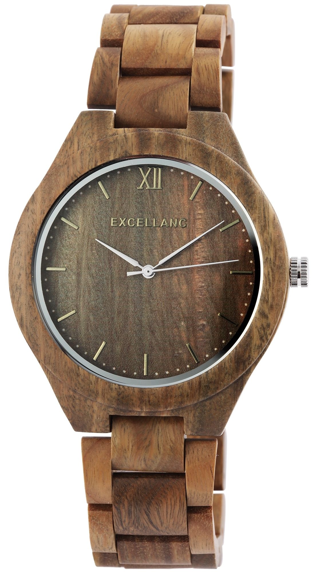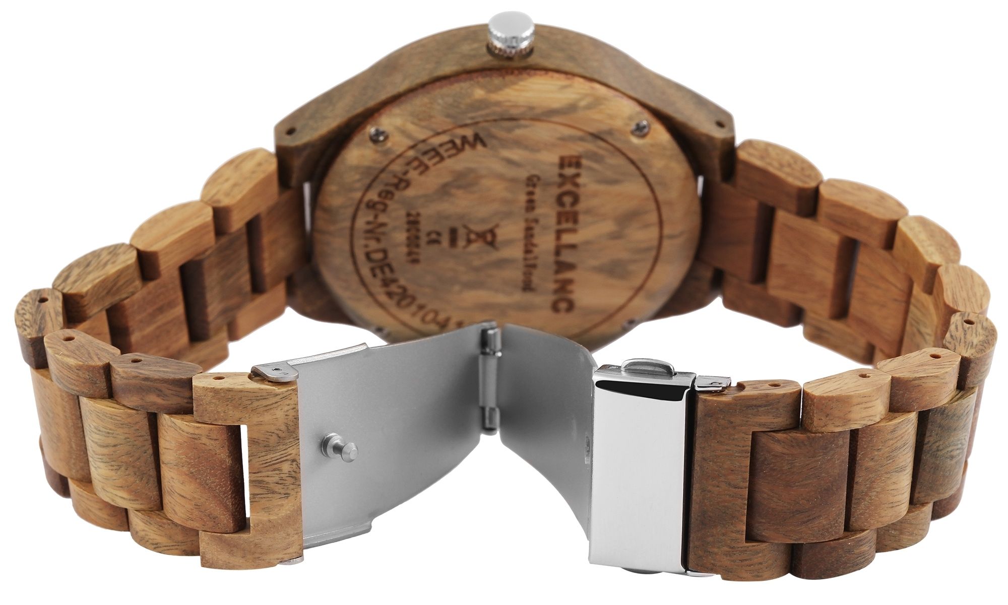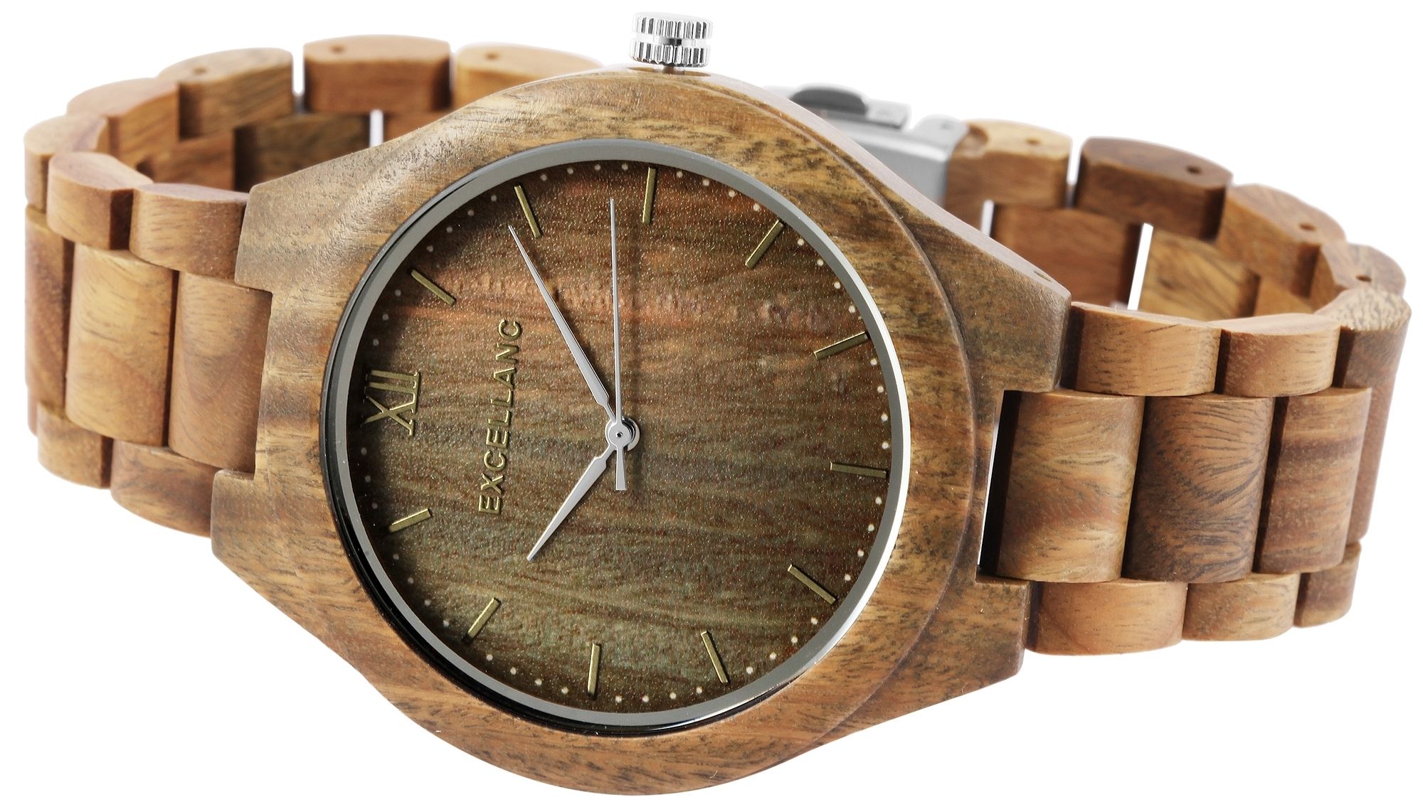 Het analoge herenpolshorloge met 3 wijzers van het merk Excellanc heeft een hoogwaardig kwartsuurwerk. De houten band is 22 mm breed bij de lug en kan worden geopend en gesloten met een roestvrijstalen vouwsluiting. De totale lengte van het horloge is 23 cm, maar kan naar wens worden ingekort dankzij de afneembare elementen. De kast, ook van hout, met een houten achterkant in dezelfde kleur en mineraalglas, heeft een diameter van 45 mm en een kasthoogte van 12 mm. Een visueel hoogtepunt is het mineraalglas met een spiegelrand aan de buitenste rand. Samen met de kleurgecoördineerde kroon op drie uur geeft dit het horloge een elegante uitstraling. De wijzerplaat is ook van hout. De wijzers en uurmarkeringen passen bij de kleur en ronden het geheel harmonieus af. Elk houten horloge is uniek en individueel. Het is een statement van duurzaam denken en tegelijkertijd een modieus accessoire. De lichtheid van de natuurlijke grondstof zorgt ervoor dat het comfortabel is om te dragen, waardoor dit tijdloze horlogemodel onmisbaar is.