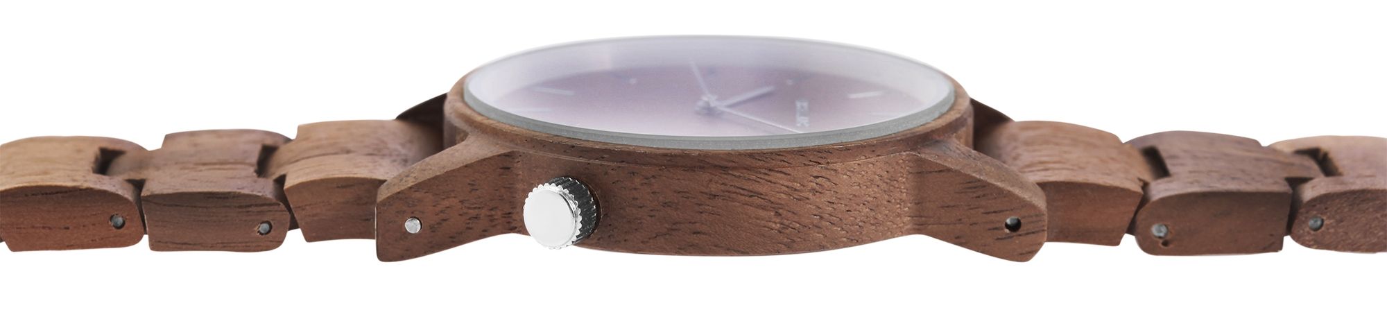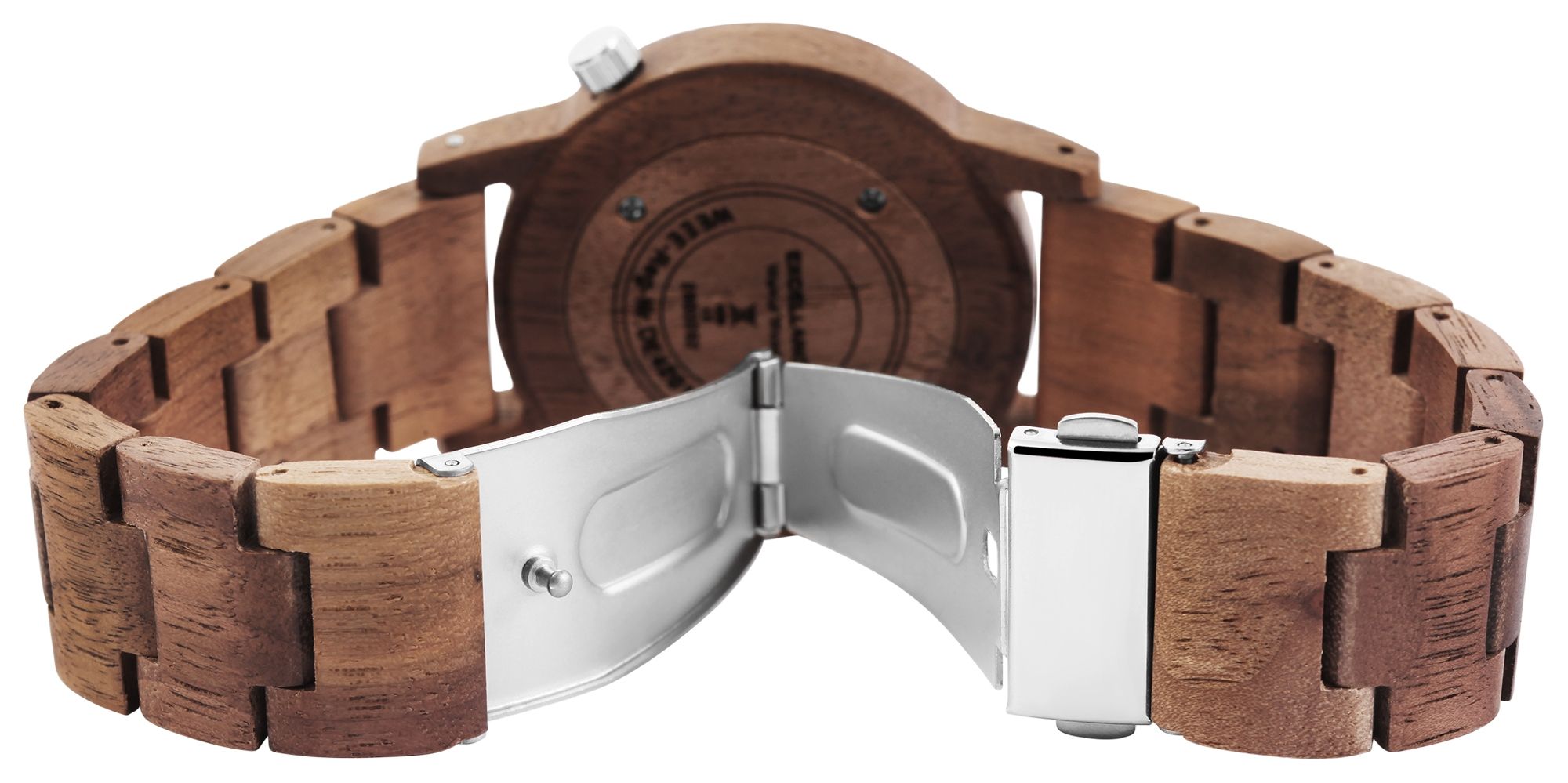 Het analoge herenpolshorloge met 3 wijzers van het merk Excellanc heeft een hoogwaardig kwartsuurwerk. De houten band van walnoothout is 20 mm breed bij de lug en kan worden geopend en gesloten met een zilverkleurige roestvrijstalen vouwsluiting. De totale lengte van het horloge is 21,5 cm. De houten kast, ook gemaakt van walnoothout, met een houten achterkant in dezelfde kleur en mineraalglas, heeft een diameter van 40 mm en een kasthoogte van 10 mm. Een visueel hoogtepunt is het mineraalglas met een zilverkleurige spiegelrand aan de buitenste rand. Samen met de zilverkleurige kroon geeft dit het horloge een elegante uitstraling. De wijzerplaat is ook gemaakt van walnotenhout. De wijzers en uurmarkeringen zijn zilverkleurig en passen goed bij de algehele look van het horloge. Tegenwoordig zijn houten horloges een absolute must om elke pols. Het materiaal maakt het horloge niet alleen bijzonder duurzaam, maar ook een absolute blikvanger.
