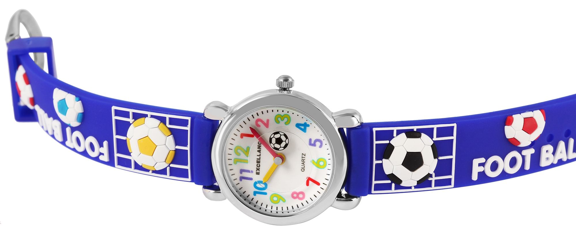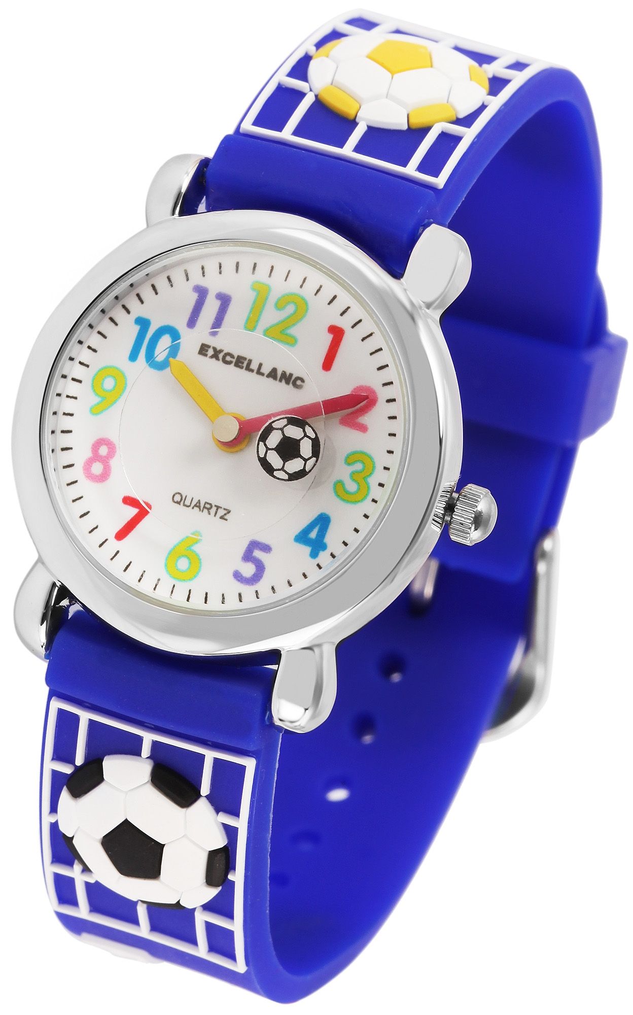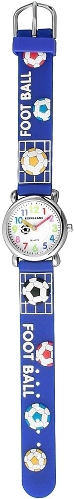 Het analoge 3-hands kinderhorloge van het merk Excellanc heeft een hoogwaardig PC21 kwartsuurwerk. De donkerblauwe siliconen band is 14 mm breed en opent met een zilverkleurige gesp. De totale lengte is 20 cm. De zilverkleurige metalen kast met mineraalglas heeft een diameter van 27 mm en een kasthoogte van 10 mm. De kastdeksel is gemaakt van roestvrij staal. De wijzerplaat is wit en de wijzers zijn in de kleuren rood en geel, die een goed contrast vormen op de witte wijzerplaat, waardoor het gemakkelijk is om de tijd af te lezen op polshorloges. Het hoogtepunt is het voetbalmotief dat zowel de siliconen band als de secondewijzer van het kinderhorloge siert.