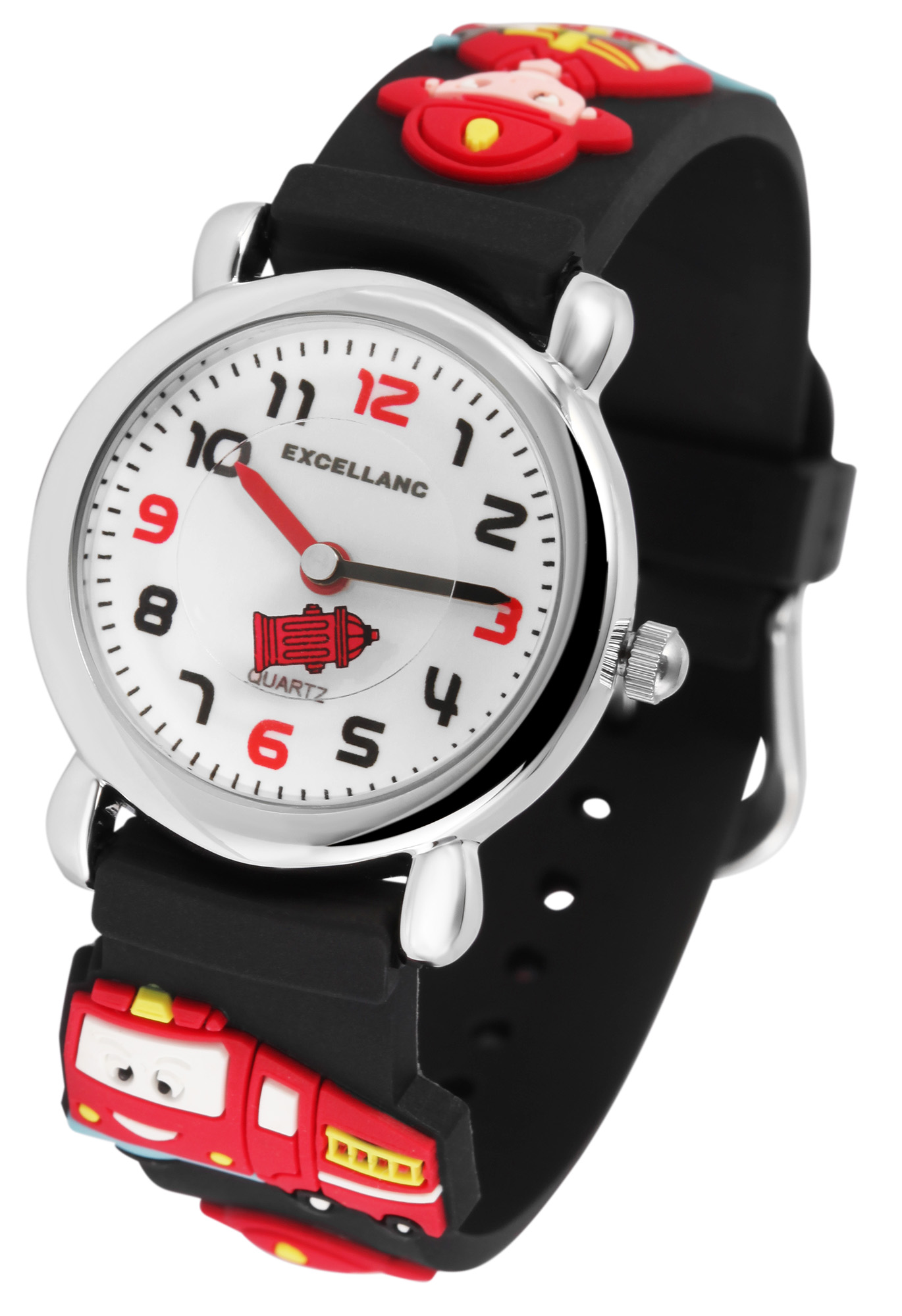 Het analoge 3-handige kinderhorloge van het merk Excellanc heeft een hoogwaardig PC21 kwartsuurwerk. De zwarte siliconen band is 14 mm breed en opent met een zilverkleurige gesp. De totale lengte van het horloge is 20 cm. De zilverkleurige metalen kast met mineraalglas heeft een diameter van 27 mm en een kasthoogte van 10 mm. De achterkant van de kast is gemaakt van roestvrij staal. De wijzers zijn zwart en rood, wat een geweldig contrast vormt op de witte wijzerplaat met zwarte en rode cijfers van 1 - 12, waardoor het gemakkelijk is om de tijd af te lezen op het kinderhorloge. Het hoogtepunt is het brandweermotief dat zowel de siliconen band als de secondewijzer van het kinderhorloge siert.