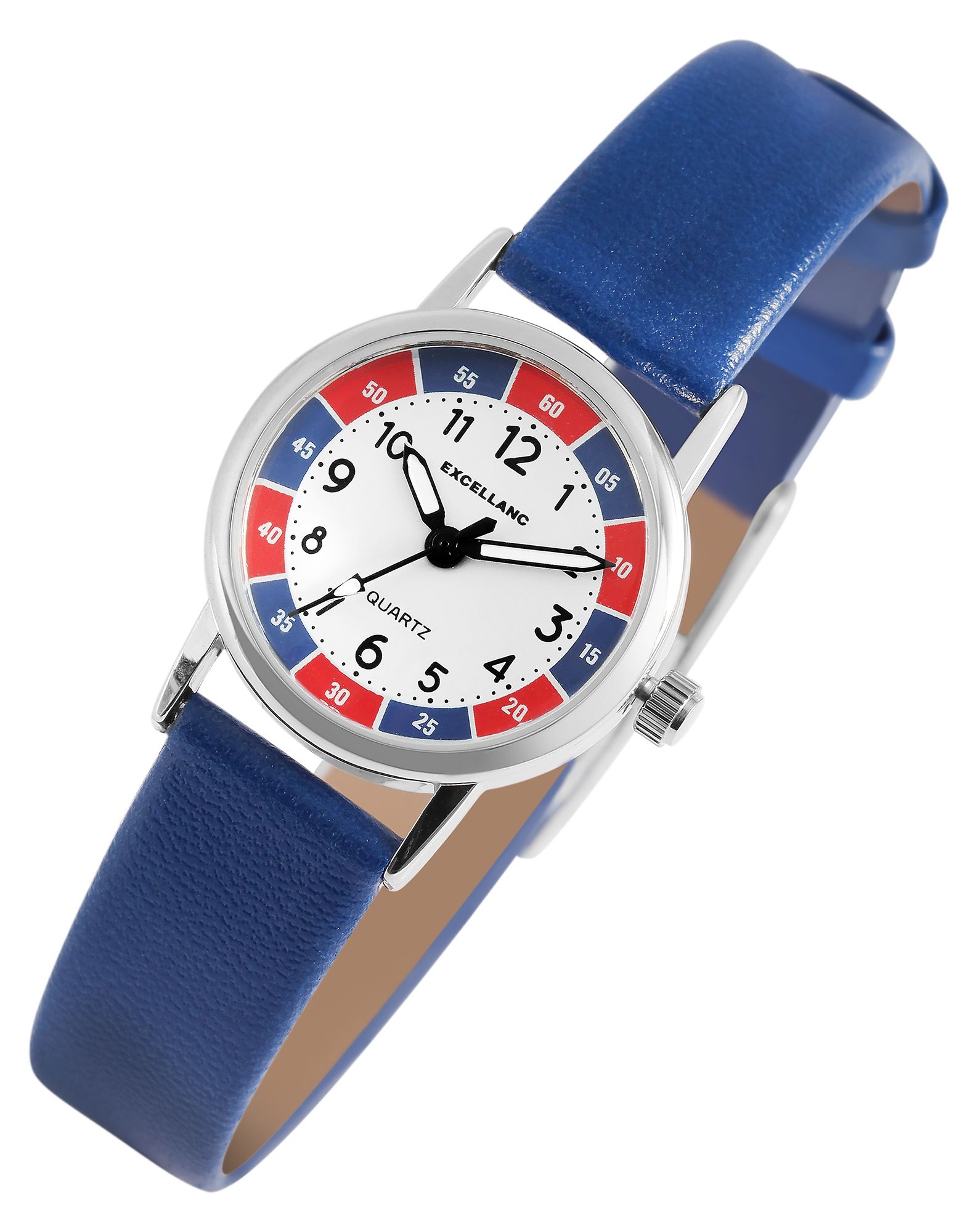 Het analoge 3-hands kinderpolshorloge van het merk Excellanc heeft een hoogwaardig kwartsuurwerk. De blauwe band van imitatieleer is 14 mm breed bij de lug en kan worden geopend en gesloten met een zilverkleurige gesp. De totale lengte van het horloge is 22 cm. De zilverkleurige metalen kast met mineraalglas heeft een diameter van 26 mm en een kasthoogte van 9 mm. De achterkant van de kast is gemaakt van roestvrij staal. De overzichtelijke en kleurgecodeerde wijzerplaat maakt het aflezen van de tijd kinderspel en helpt kinderen op betrouwbare wijze de tijd te leren. De tijd kan ook in het donker worden afgelezen dankzij de Superluminova-gecoate wijzers.