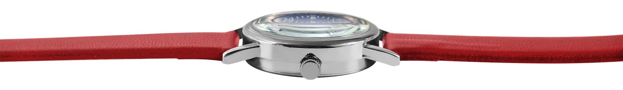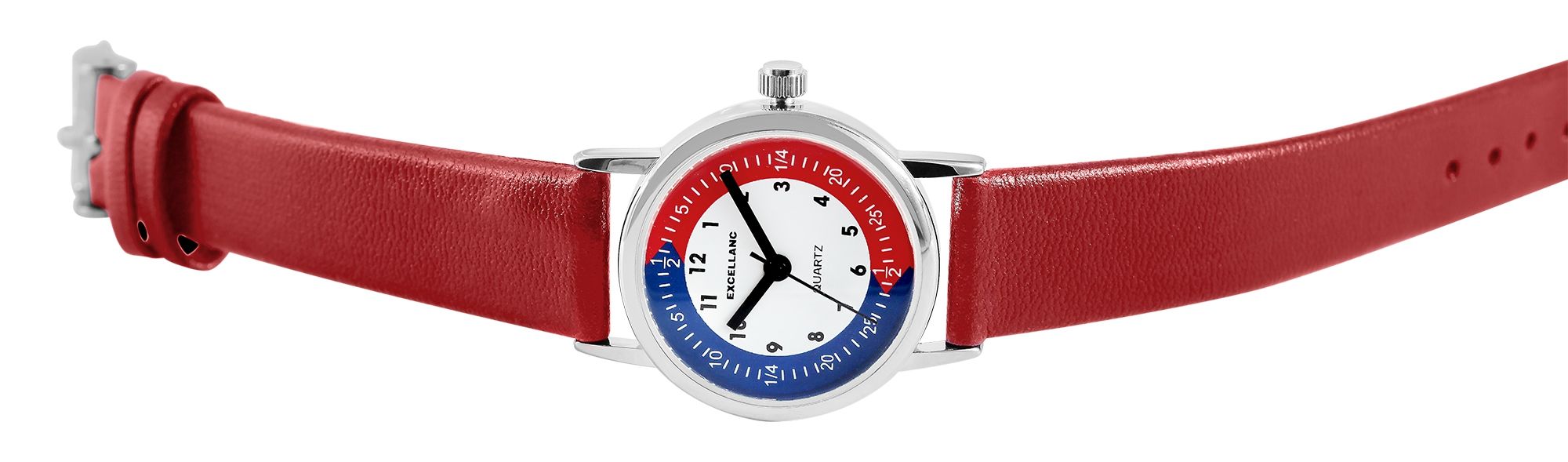 Het analoge 3-hands kinderpolshorloge van het merk Excellanc heeft een hoogwaardig kwartsuurwerk. De rode band van imitatieleer is 14 mm breed bij de lug en kan worden geopend en gesloten met een zilverkleurige gesp. De totale lengte van het horloge is 22 cm. De zilverkleurige metalen kast met mineraalglas heeft een diameter van 26 mm en een kasthoogte van 9 mm. De achterkant van de kast is gemaakt van roestvrij staal. De overzichtelijke wijzerplaat met kleurcodes maakt het aflezen van de tijd kinderspel en helpt kinderen op betrouwbare wijze de tijd te leren.