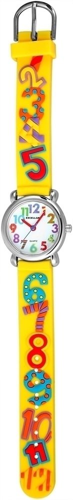 Het analoge 3-hands kinderpolshorloge van het merk Excellanc heeft een hoogwaardig PC21 kwartsuurwerk. De gele siliconen band is 14 mm breed bij de lug en kan worden geopend en gesloten met een zilverkleurige gesp. De totale lengte van het horloge is 20 cm. De zilverkleurige metalen kast met mineraalglas heeft een diameter van 27 mm en een kasthoogte van 10 mm. De achterkant van de kast is gemaakt van roestvrij staal. De kleurrijke rubberen band zorgt voor draagcomfort. De cijfers van één tot twaalf zijn erop te vinden en zorgen voor een mooie verbinding met de wijzerplaat. Deze is wit en bedrukt met twaalf kleurrijke cijfers. De uur- en minutenwijzers zijn ook rood en de secondewijzer is paars.