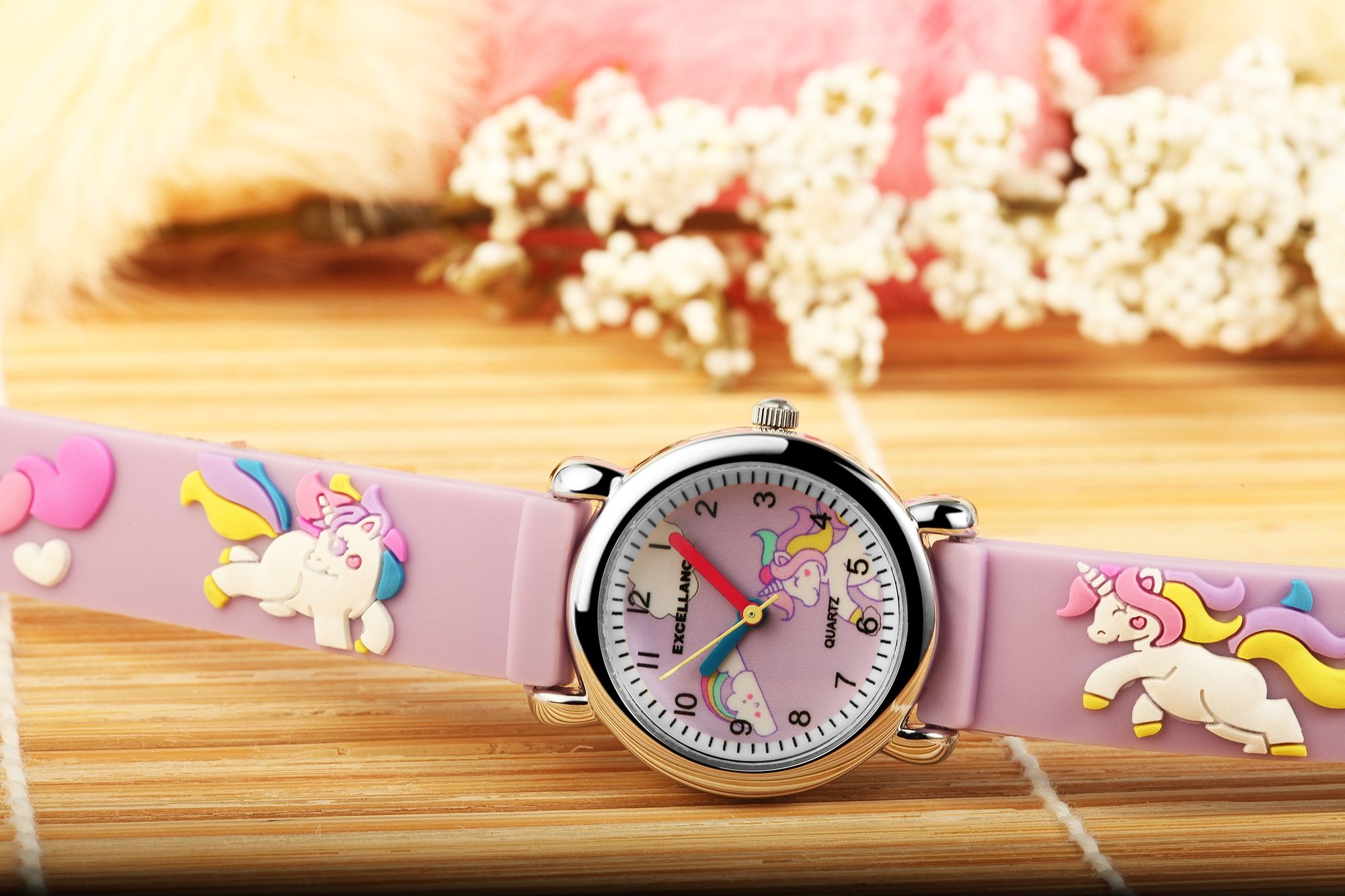 Het analoge 3-hands kinderpolshorloge van het merk Excellanc heeft een hoogwaardig PC21 kwartsuurwerk. De lilakleurige siliconen band is 14 mm breed bij de lug en kan worden geopend en gesloten met een zilverkleurige gesp. De totale lengte van het horloge is 20 cm. De zilverkleurige metalen kast met mineraalglas heeft een diameter van 27 mm en een kasthoogte van 10 mm. De achterkant van de kast is gemaakt van roestvrij staal. De kleurrijke rubberen band is versierd met kleurrijke eenhoornmotieven en is comfortabel om te dragen. De wijzerplaat is ook lila-kleurig en bedrukt met zwarte cijfers en indexen. De motieven op de band zijn ook terug te vinden op de wijzerplaat. De uurwijzer is blauw, de minutenwijzer is rood en de secondewijzer is geel. Dit maakt het gemakkelijker om de tijd te leren en af te lezen.
