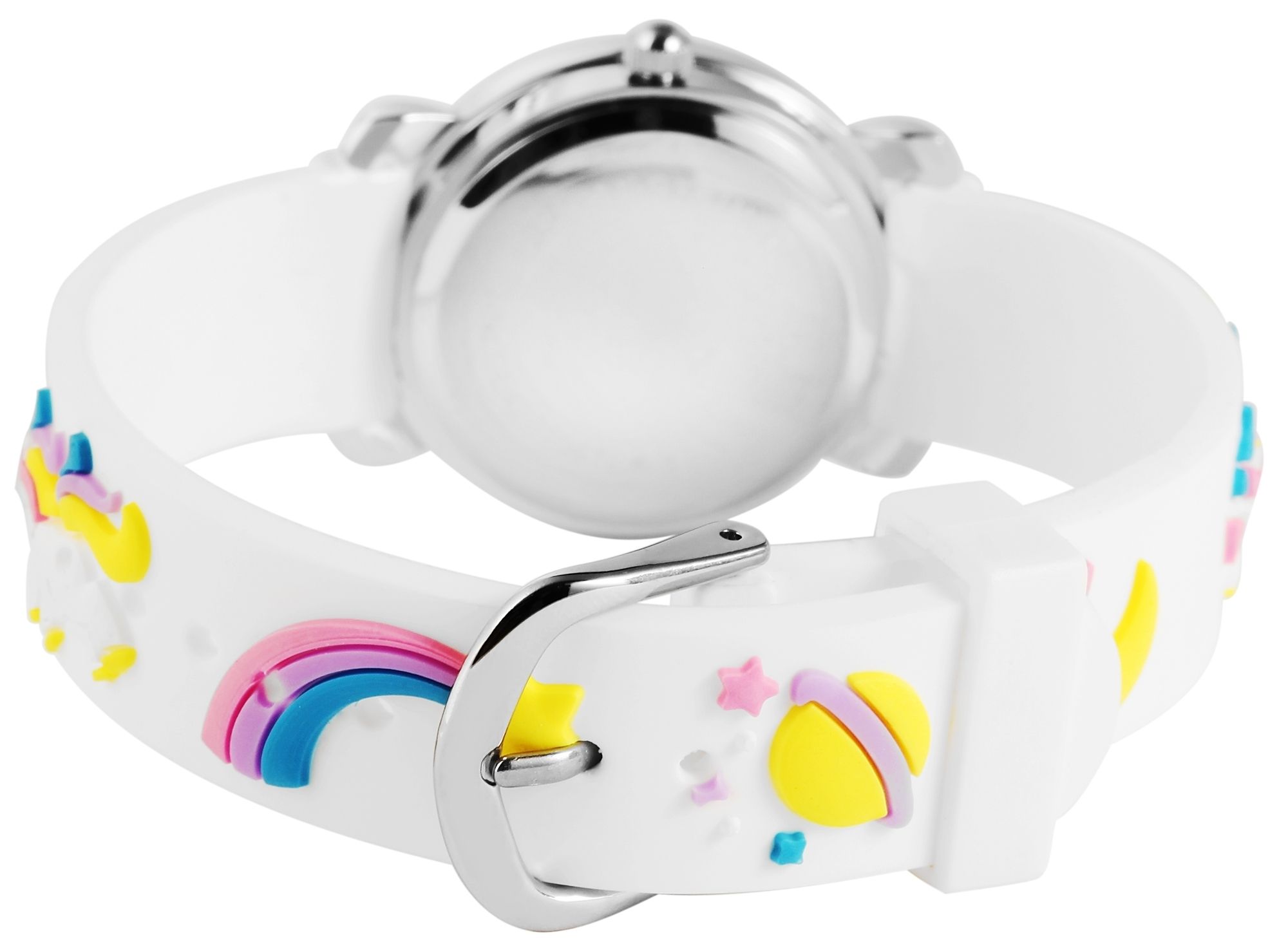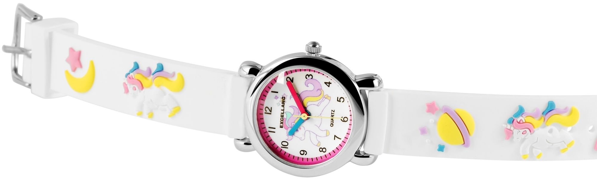 Het analoge 3-hands kinderpolshorloge van het merk Excellanc heeft een hoogwaardig PC21 kwartsuurwerk. De witte siliconen band is 14 mm breed bij de lug en kan worden geopend en gesloten met een zilverkleurige gesp. De totale lengte van het horloge is 20 cm. De zilverkleurige metalen kast met mineraalglas heeft een diameter van 27 mm en een kasthoogte van 10 mm. De achterkant van de kast is gemaakt van roestvrij staal. De kleurrijke rubberen band is versierd met twee grote eenhoorns en verschillende kleurrijke motieven uit het zonnestelsel en is comfortabel om te dragen. De wijzerplaat is wit en bedrukt met zwarte cijfers en indexen. Er staat ook een groot eenhoornmotief op de wijzerplaat. De uurwijzer is blauw, de minutenwijzer is rood en de secondewijzer is geel. Dit maakt het gemakkelijker om de tijd te leren en af te lezen.