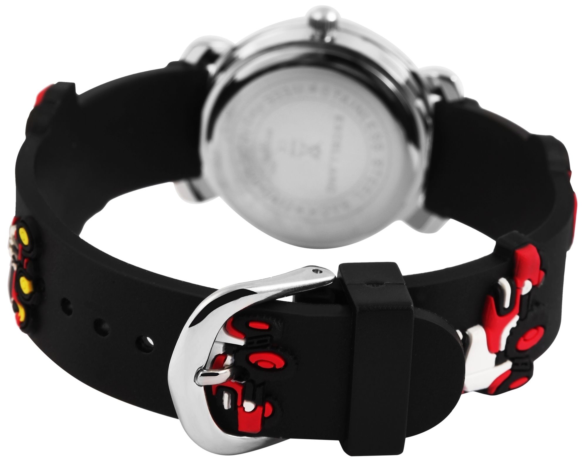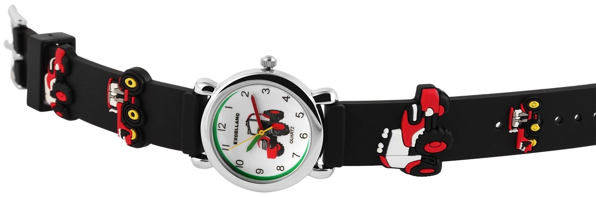Het analoge 3-hands kinderpolshorloge van het merk Excellanc heeft een hoogwaardig PC21 kwartsuurwerk. De zwarte siliconen band is 14 mm breed bij de lug en kan worden geopend en gesloten met een zilverkleurige gesp. De totale lengte van het horloge is 20 cm. De zilverkleurige metalen kast met mineraalglas heeft een diameter van 27 mm en een kasthoogte van 10 mm. De achterkant van de kast is gemaakt van roestvrij staal. De zwarte rubberen band is versierd met verschillende rode trekkermotieven en is comfortabel om te dragen. De wijzerplaat is wit en bedrukt met zwarte cijfers. Daarnaast is de wijzerplaat versierd met een groene streep aan de buitenrand en een groot rood tractor motief in het midden. De uurwijzer is groen, de minutenwijzer is rood en de secondewijzer is geel. Dit maakt het gemakkelijker om de tijd te leren en af te lezen.