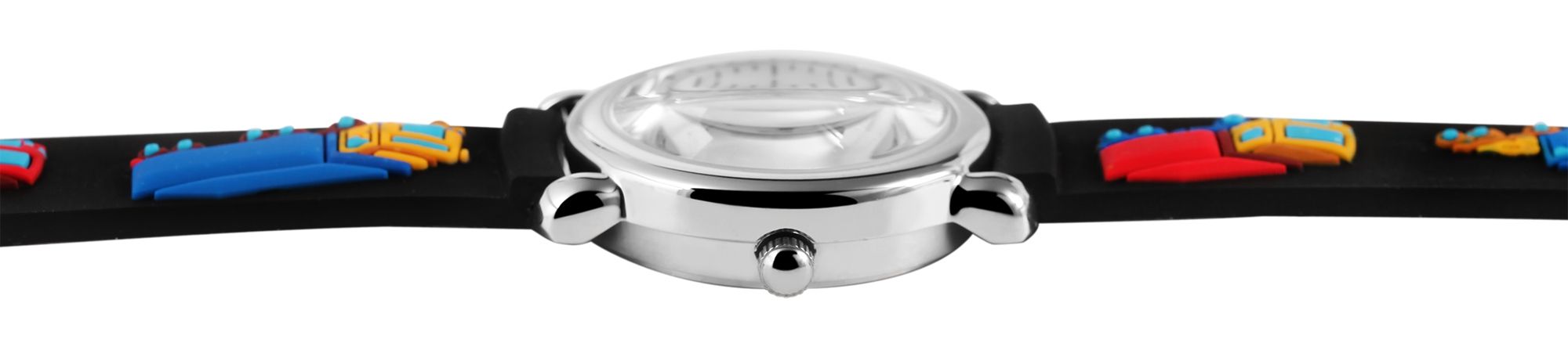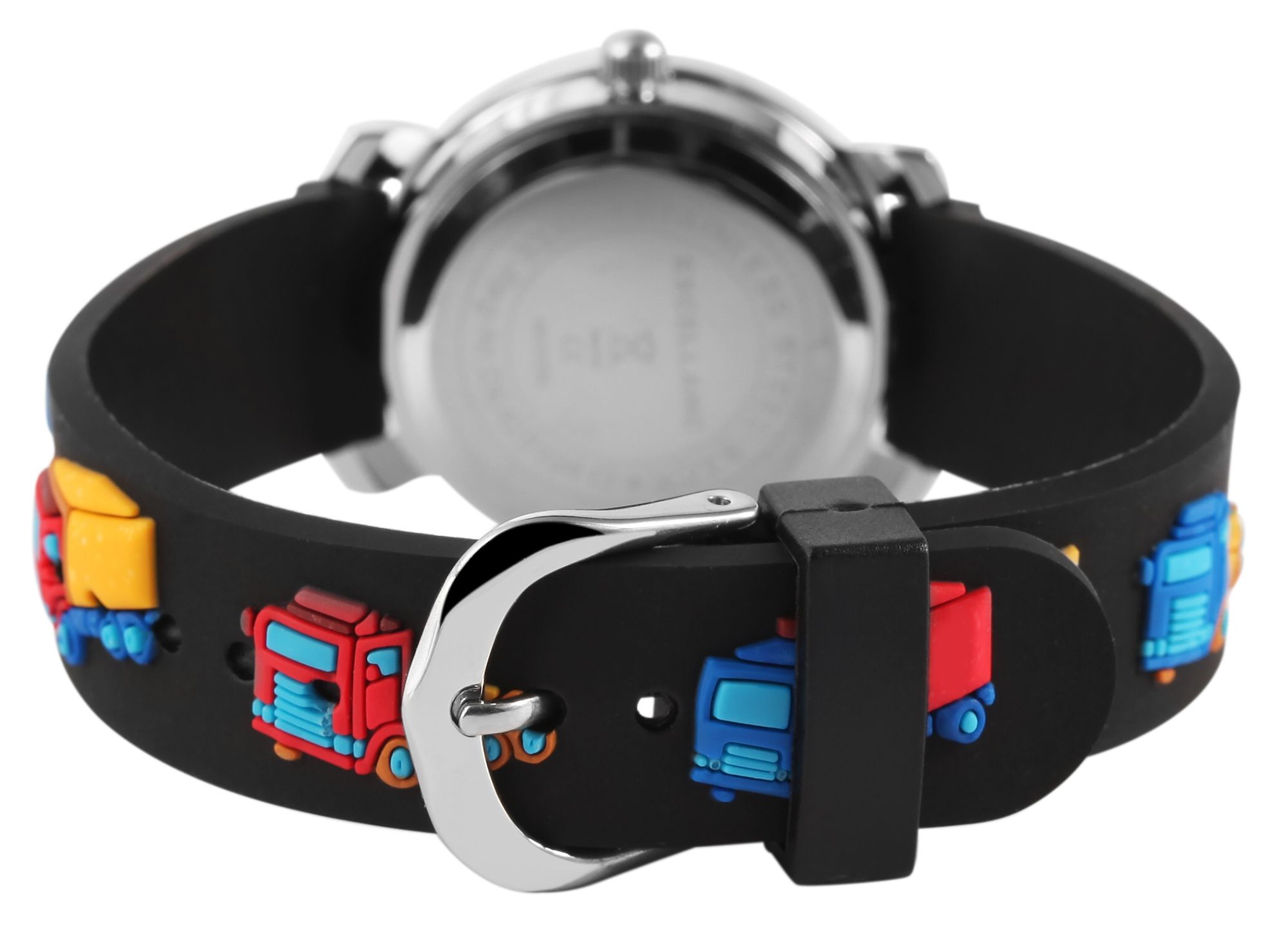 Het analoge 3-hands kinderpolshorloge van het merk Excellanc heeft een hoogwaardig PC21 kwartsuurwerk. De siliconen band is 14 mm breed bij de lug en kan worden geopend en gesloten met een gesp. De totale lengte van het horloge is 20 cm. De zilverkleurige metalen kast met mineraalglas heeft een diameter van 27 mm en een kasthoogte van 10 mm. De achterkant van de kast is gemaakt van roestvrij staal. De zwarte rubberen band is versierd met verschillende vrachtwagens en is comfortabel om te dragen. De witte wijzerplaat is bedrukt met zwarte cijfers. De uren-, minuten- en secondewijzers zijn zwart.