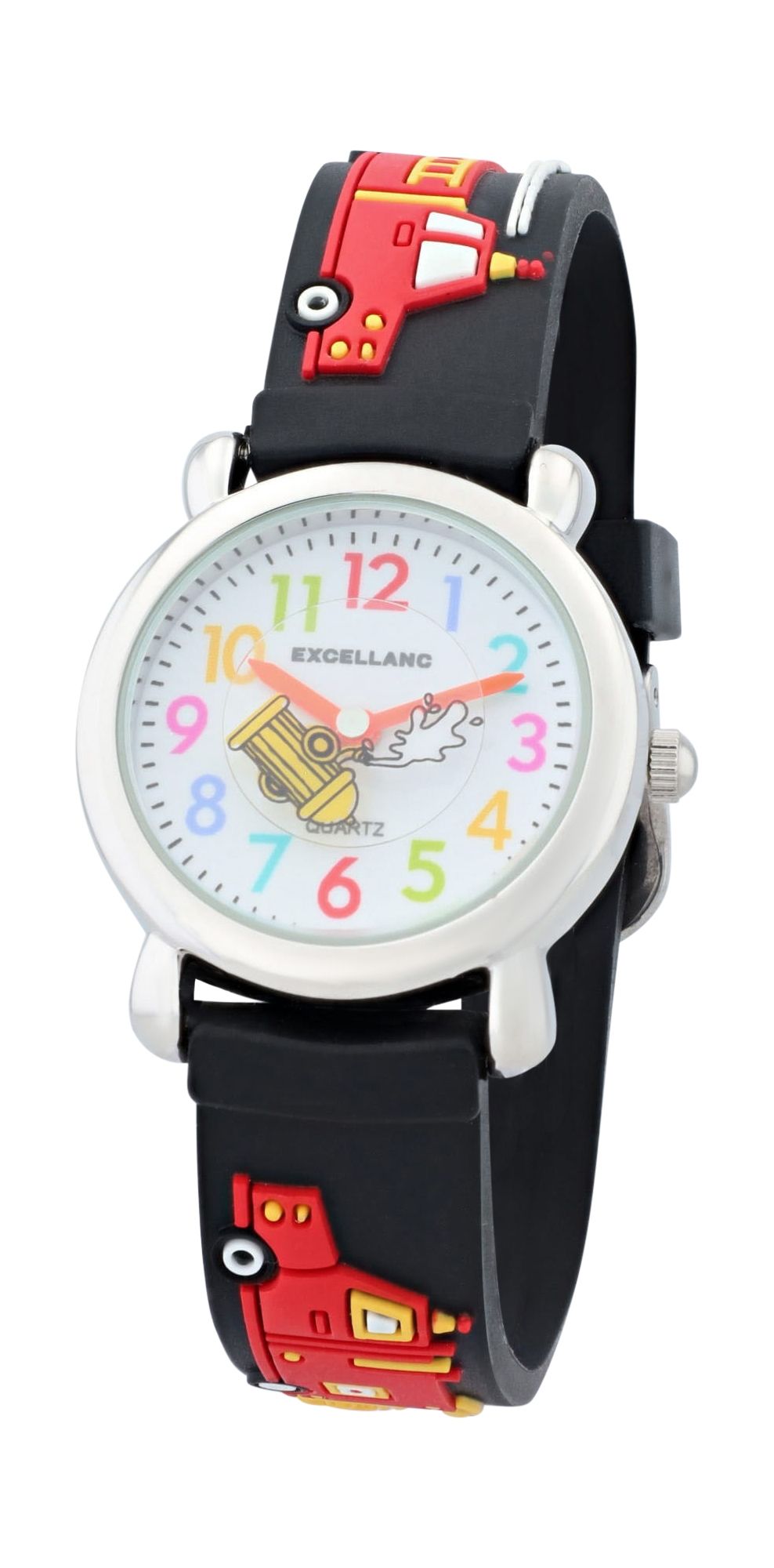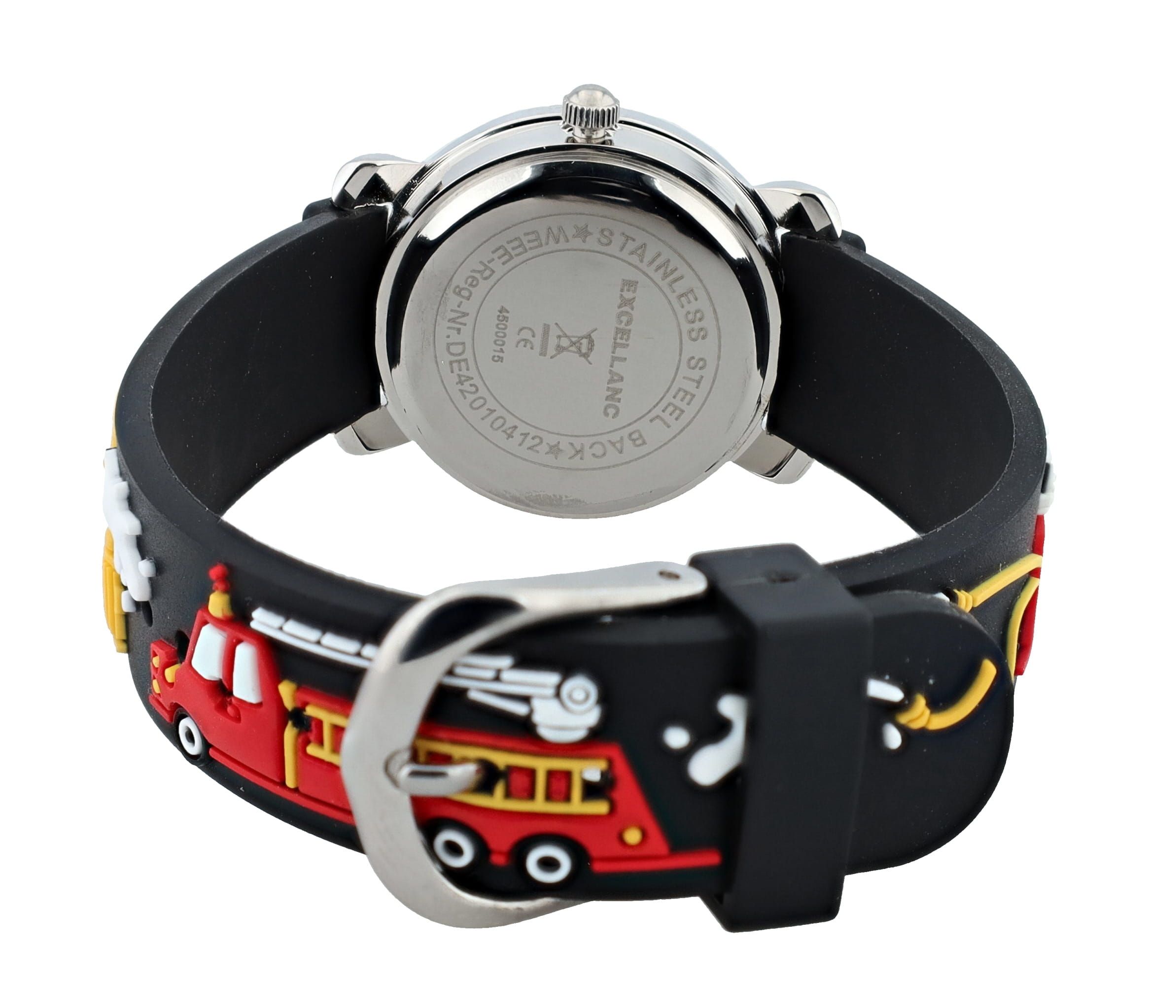 Het analoge 3-hands kinderpolshorloge van het merk Excellanc heeft een hoogwaardig PC21 kwartsuurwerk. De zwarte siliconen band is 14 mm breed bij de lug en kan worden geopend en gesloten met een zilverkleurige gesp. De totale lengte van het horloge is 20 cm. De zilverkleurige metalen kast met mineraalglas heeft een diameter van 27 mm en een kasthoogte van 10 mm. De achterkant van de kast is gemaakt van roestvrij staal. De zwarte rubberen band is versierd met rode brandweermotieven en is comfortabel om te dragen. De wijzerplaat is wit en bedrukt met kleurrijke cijfers. De uur- en minutenwijzers zijn neon oranje en helpen je de tijd af te lezen. De speciale secondewijzer bestaat uit een fijne transparante schijf met een gele brandkraan erop gedrukt.