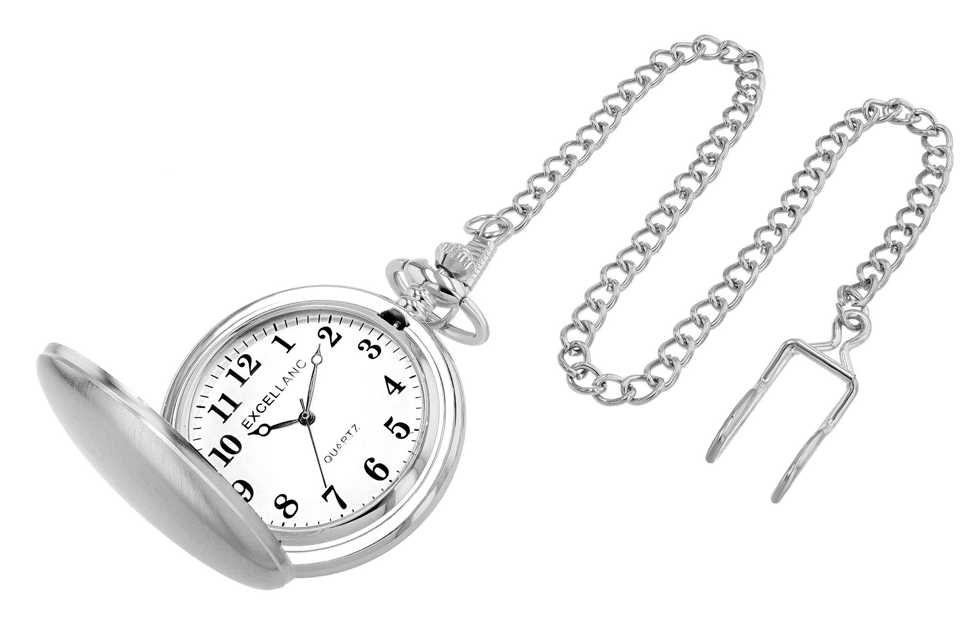 Het analoge zakhorloge met 3 wijzers van het merk Excellanc heeft een quartz-uurwerk van hoge kwaliteit. De ronde kast van het horloge is volledig van metaal. Het zakhorloge kan met een druk op de knop worden geopend om de analoge wijzerplaat met Arabische cijfers en drie wijzers te onthullen. Een ca. 36 cm lange, kleurgecoördineerde horlogeketting met een metalen haakje wordt gebruikt om het zakhorloge aan te bevestigen. De diameter van de kast is 47 mm en de hoogte van de kast is 15 mm. De eenvoudige horlogekast kan naar wens worden gegraveerd, waardoor het een ideaal cadeau is voor een echte horlogeverzamelaar.