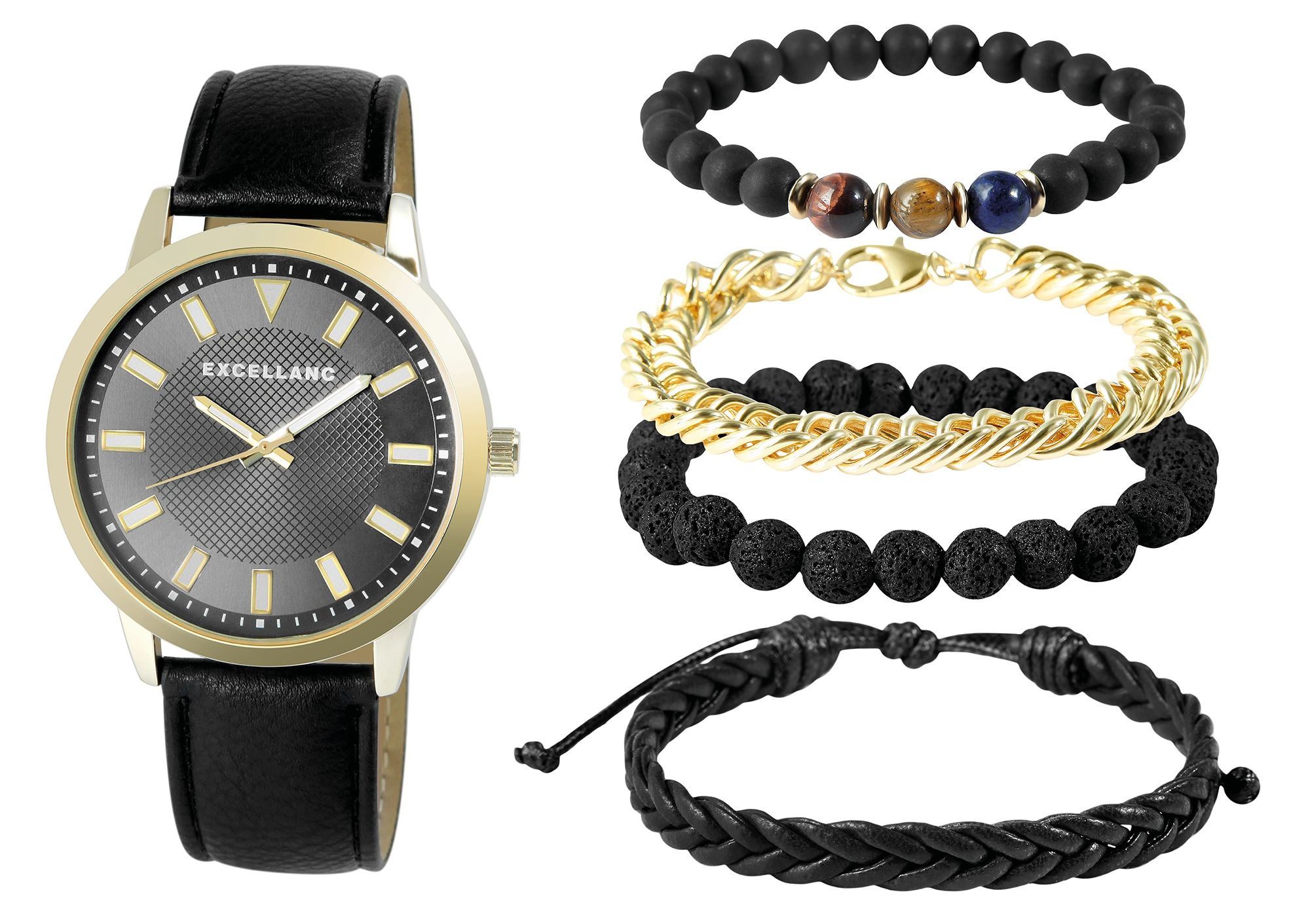 Productinformatie "Excellance geschenkset met herenpolshorloge en vier armbanden, zwart/goudkleurig"