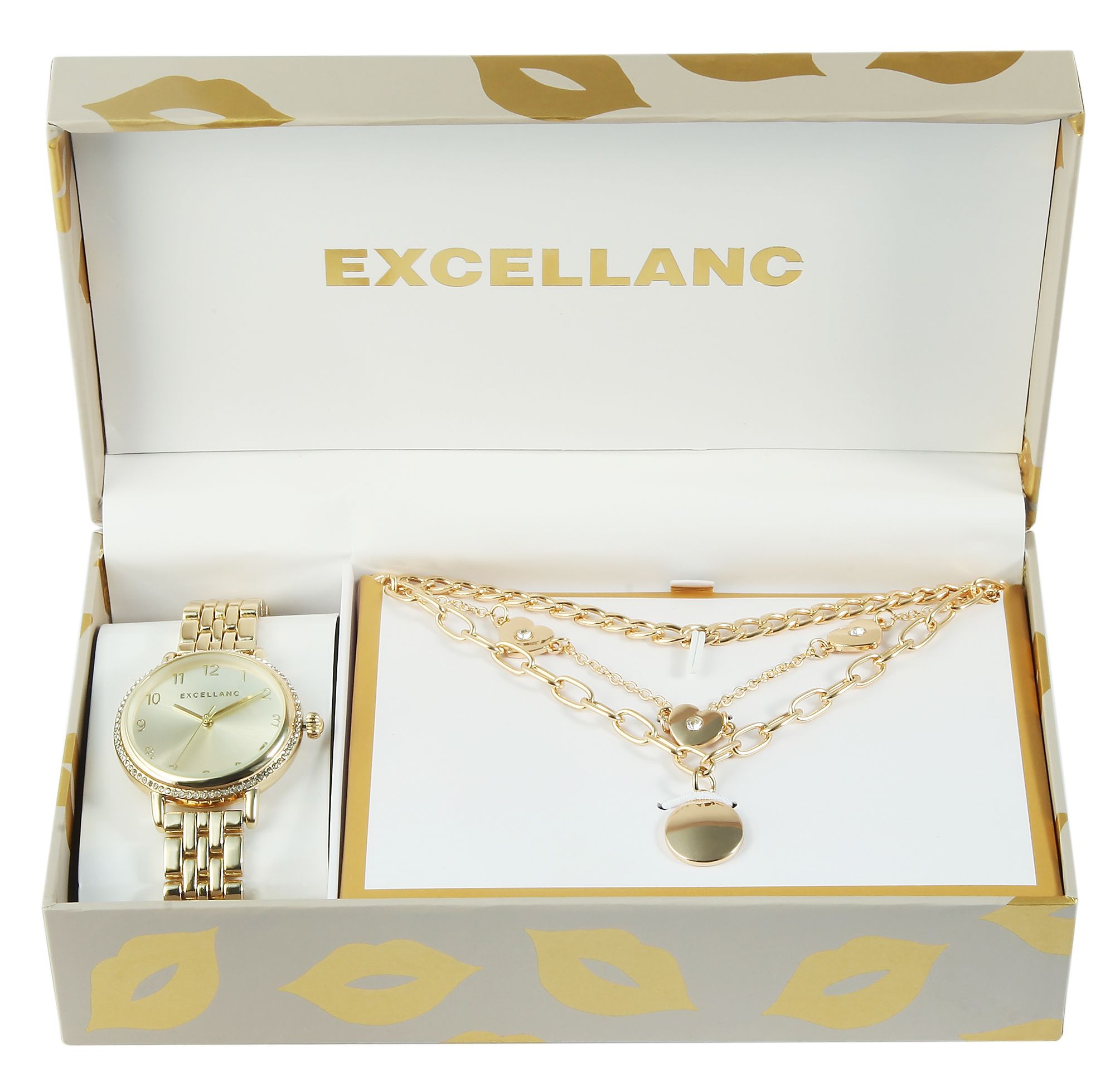 De cadeauset van het merk Excellanc bestaat uit een damespolshorloge en drie kettingen. De sieraden zijn ideaal om in combinatie te dragen, bijvoorbeeld in een trendy laagjeslook, omdat ze samen een harmonieuze eenheid vormen. Het analoge damespolshorloge met 3 wijzers van het merk Excellanc heeft een hoogwaardig en nauwkeurig kwartsuurwerk. De schakelarmband is gemaakt van metaal, is 14 mm breed bij de lug en kan worden geopend en gesloten met een vouwsluiting. De totale lengte van het horloge is 21 cm. Dankzij de afneembare elementen kan de lengte echter naar wens worden aangepast met behulp van een geschikt gereedschap. De metalen kast met gewelfd mineraalglas heeft een diameter van 34 mm en een kasthoogte van 11 mm. De opvallende kenmerken van dit horloge zijn de Similis-stenen die de kast sieren ter hoogte van de lunette. De set bevat ook een 45 cm lange krulketting, een 44 cm lange ankerketting met drie hartvormige hangers en een 52 cm lange, ovaalvormige sieradenketting met een ronde hanger. Alle kettingen kunnen worden geopend en gesloten met een klassieke karabijnsluiting en kunnen individueel in lengte worden aangepast dankzij verlengkettingen. De damesset is een allround blikvanger en een fantastisch cadeau, want elke set wordt verzonden in een hoogwaardige doos. Met deze indrukwekkende sieraden vestig je vakkundig de aandacht op jezelf en je modieuze accessoires.