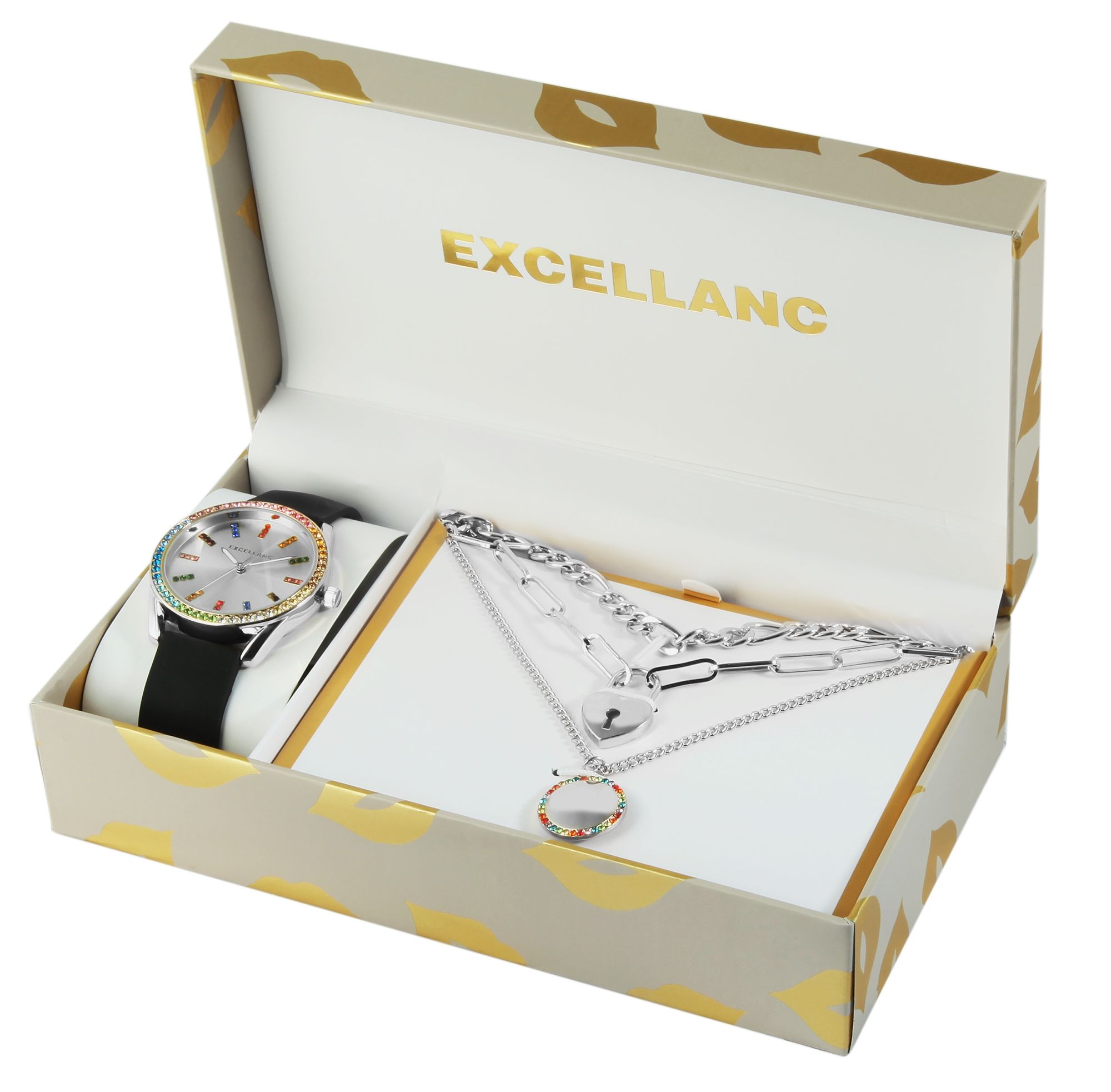 De cadeauset van het merk Excellanc bestaat uit een damespolshorloge en drie kettingen. De sieraden zijn ideaal om in combinatie te dragen, bijvoorbeeld in een trendy laagjeslook, omdat ze samen een harmonieus geheel vormen. Het analoge damespolshorloge met 3 wijzers heeft een hoogwaardig en nauwkeurig kwartsuurwerk. De zachte siliconen band is 18 mm breed bij de lug en kan worden geopend en gesloten met een gesp. Het bandje is zeer comfortabel om te dragen, zit goed om de pols en is bijzonder duurzaam. De totale lengte van het horloge is 24 cm. De metalen kast met mineraalglas heeft een diameter van 38 mm en een kasthoogte van 8 mm. De opvallende kenmerken van dit horloge zijn de kleurrijke Similis-stenen die de lunette sieren. De wijzerplaat is ook voorzien van fonkelende baguette-vormige simili-stenen die dienen als uurmarkering. De overzichtelijke wijzerplaat met streepindexen maakt het snel en gemakkelijk om de huidige tijd af te lezen. Dankzij de Superluminova-gecoate wijzers is dit ook mogelijk in het donker. De set bevat ook een 47 cm lange Figaro ketting, een 50 cm lange ankerketting met een ronde hanger en kleurrijke Similib bies en een 40 cm lange sieradenketting, die in het midden wordt onderbroken door een hanger met hartjesslot. Alle kettingen kunnen worden geopend en gesloten met een klassieke karabijnsluiting en kunnen individueel in lengte worden aangepast dankzij de verlengkettingen. De damesset is een allround blikvanger en een fantastisch cadeau, want elke set wordt verzonden in een hoogwaardige doos. Met deze indrukwekkende sieraden vestig je vakkundig de aandacht op jezelf en je modieuze accessoires.