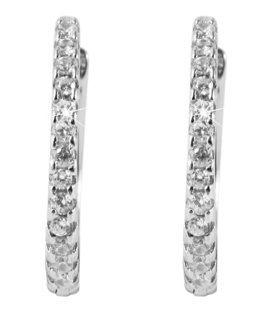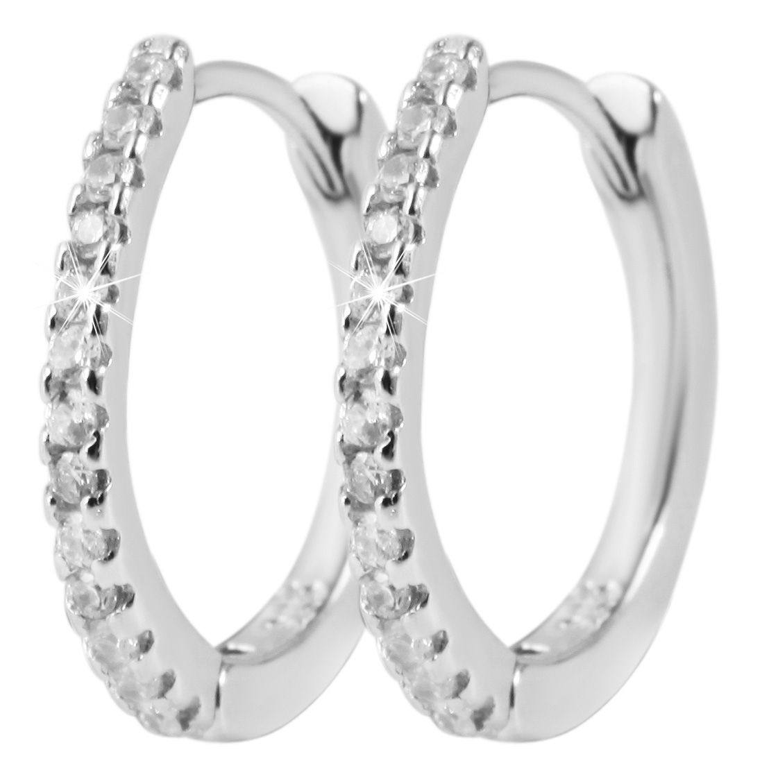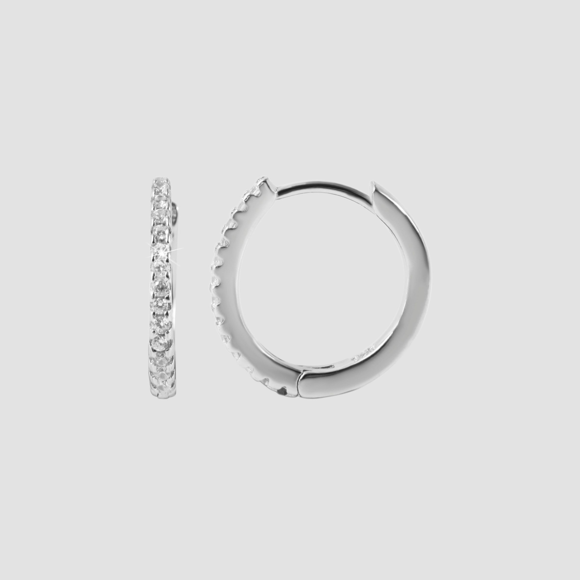 De delicate scharnierende hoepeloorbellen voor dames, versierd met 13 fonkelende zirkonia steentjes per oorbel, zijn gemaakt van 925/sterling zilver. De hoepeloorbellen hebben een eenvoudige en tijdloze elegantie en kunnen gecombineerd worden met elke gelegenheid en elke outfit. Ze hebben een praktische scharniersluiting waardoor ze gemakkelijk aan en uit te doen zijn. De maat resulteert uit een diameter van 10 mm, een breedte van 1,5 mm en een dikte van 1,5 mm. Dit product wordt geleverd op een witte juwelenkaart. De afmetingen zijn 38 x 55 mm en ideaal om te presenteren in een passende display of om cadeau te geven.