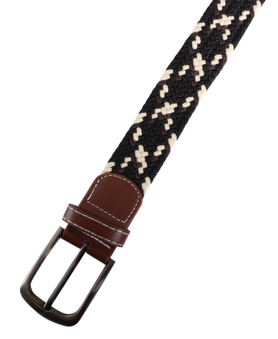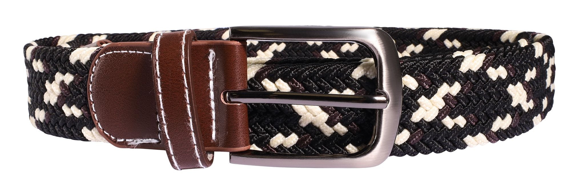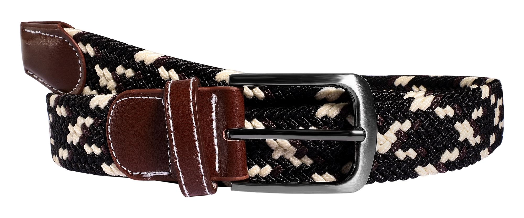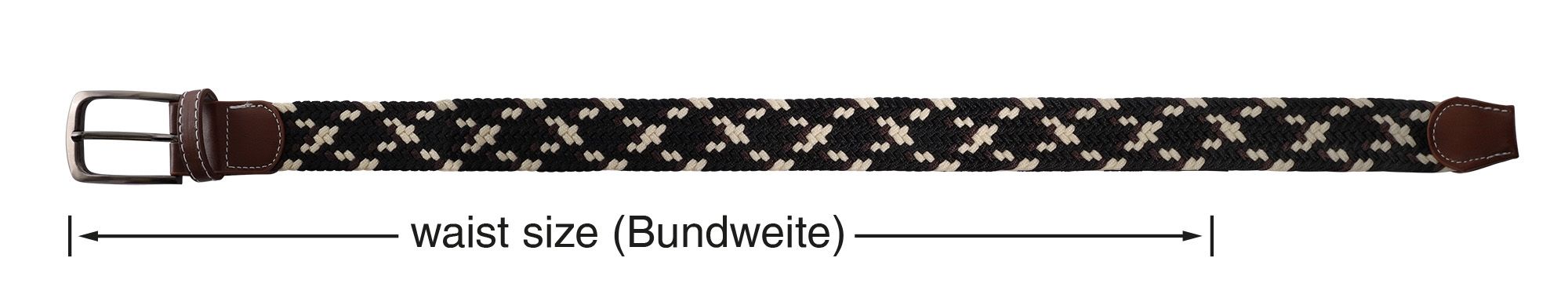 De stoffen riem in de kleuren bruin, beige en zwart met een gevlochten patroon maakt indruk met zijn sportieve look. De gevlochten riem krijgt een elegante touch met de bruine kunstlederen applicaties aan beide uiteinden. Onze gevlochten riem is gemaakt van hoogwaardig textielmateriaal en is comfortabel om te dragen. De riem heeft een robuuste metalen gesp die je precies kunt vastmaken waar dat voor jou het prettigst is. Met onze gevlochten riem heb je verschillende lengteopties van 100 cm, 110 cm en 120 cm, hij heeft een breedte van 3,2 cm en een dikte van 0,5 cm, dus er is voor iedereen een geschikte maat. Het materiaal maakt hem zeer robuust, duurzaam en scheurbestendig. Een geweldige vrijetijdsriem van textiel voor een sportieve look.