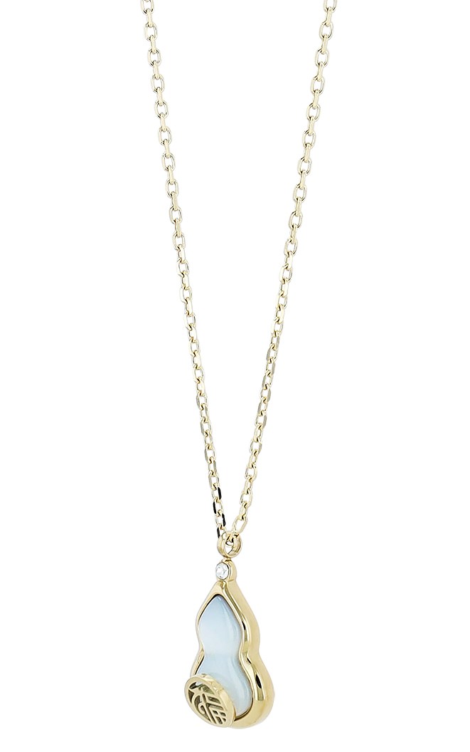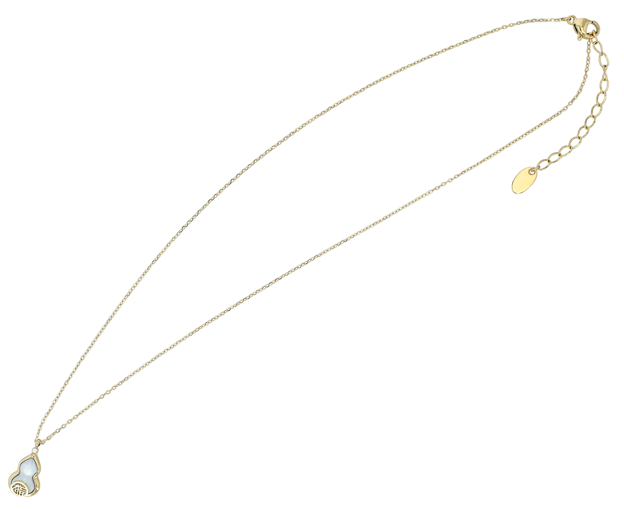 Deze elegante, goudkleurige roestvrijstalen ketting combineert stijlvol design met diepe symboliek. De kunstig ontworpen hanger in de vorm van een kalebas - een traditioneel symbool van lang leven, geluk en voorspoed - geeft dit sieraad een speciale betekenis. De 17,5 mm lange en 9 mm brede hanger is bedekt met glinsterend parelmoer en versierd met een fonkelende zirkonia. Een klein, aangebracht Chinees symbool benadrukt de spirituele boodschap van het ontwerp. Met een totale lengte van 41,5 cm en een extra verlenging van 5 cm biedt de ketting flexibele draagopties. De praktische karabijnsluiting zorgt voor een stevige grip en comfortabel dragen. Een perfect accessoire voor iedereen die waarde hecht aan stijlvolle elegantie en positieve energie.