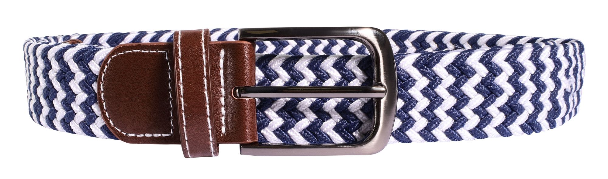 De sportieve riem van gevlochten textiel in marineblauw en wit met zigzagpatroon drukt de sportieve stijl van de drager uit. De bruine kunstlederen applicaties geven hem een elegante touch. Onze gevlochten riem is gemaakt van hoogwaardig textielmateriaal en is comfortabel om te dragen. Met verschillende lengteopties van 100 cm, 110 cm en 120 cm, een breedte van 3,2 cm en een dikte van 0,5 cm is er voor iedereen een geschikte maat. De riem heeft een robuuste metalen gesp. Een geweldige casual riem van textiel voor een sportieve look. Het materiaal maakt hem zeer robuust, duurzaam en scheurbestendig.