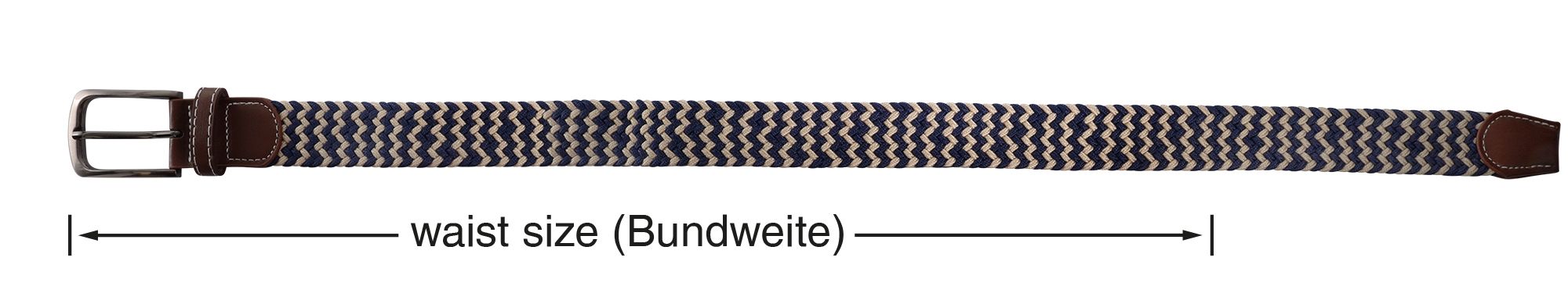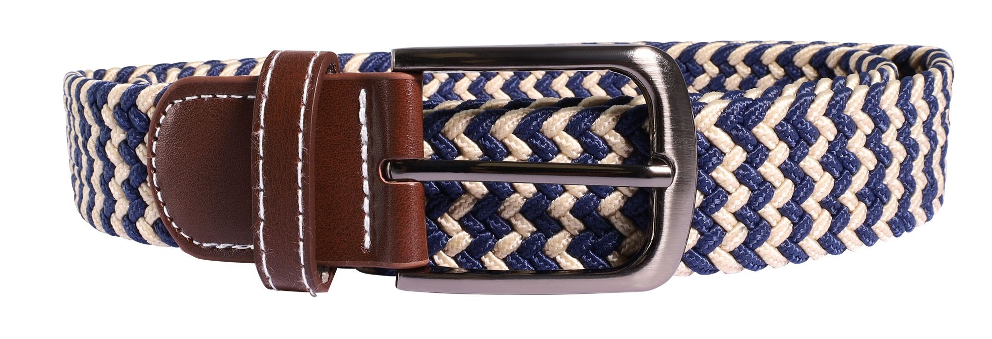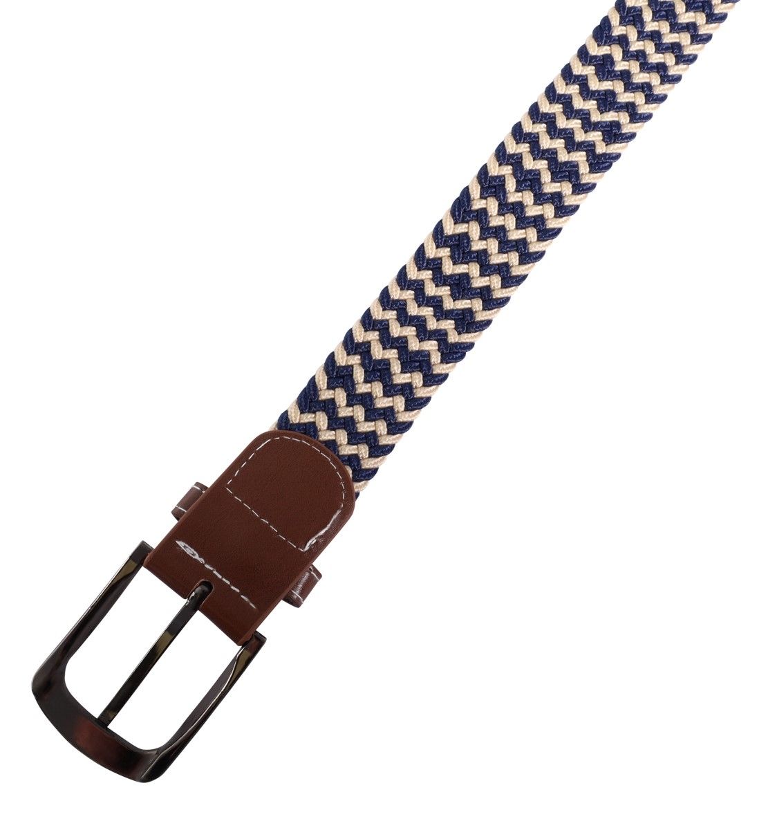 De textielen riem in de kleuren blauw en beige met een zigzagpatroon maakt indruk met zijn sportieve look. De gevlochten riem krijgt een elegante touch met de bruine kunstlederen applicaties aan beide uiteinden. Onze gevlochten riem is gemaakt van hoogwaardig textielmateriaal en is comfortabel om te dragen. De riem heeft een robuuste metalen gesp die je precies kunt vastmaken waar dat voor jou het prettigst is. Met onze gevlochten riem heb je verschillende lengteopties van 100 cm, 110 cm en 120 cm, hij heeft een breedte van 3,2 cm en een dikte van 0,5 cm, dus er is voor iedereen een geschikte maat. Het materiaal maakt hem zeer robuust, duurzaam en scheurbestendig. Een geweldige vrijetijdsriem van textiel voor een sportieve look.