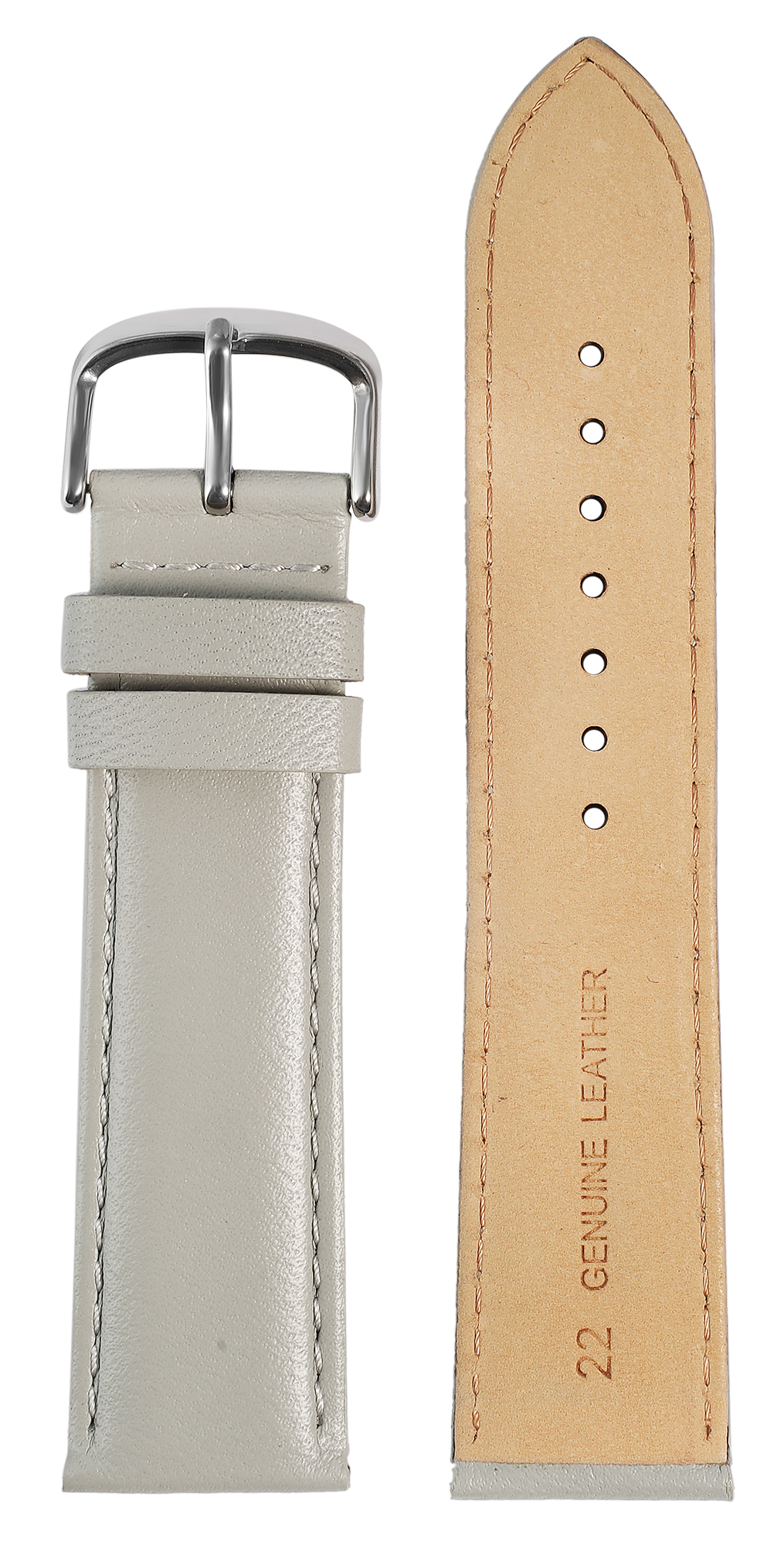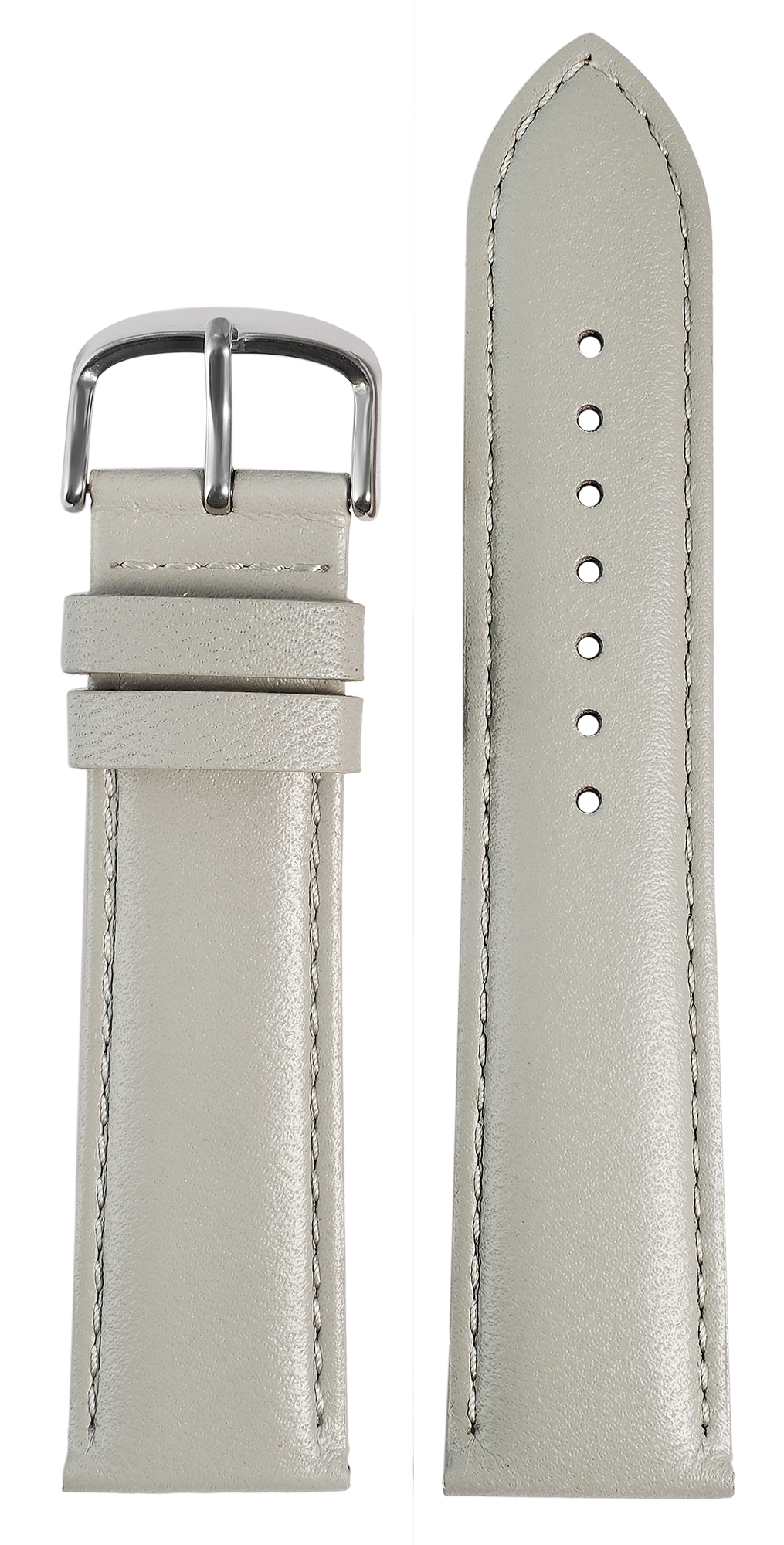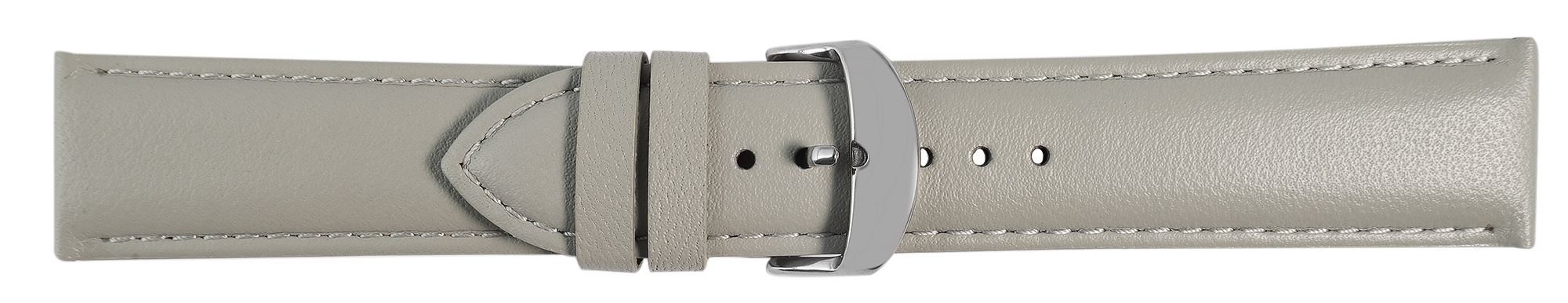 Deze horlogeband van hoogwaardig echt leer in de kleur grijs is verkrijgbaar in de lugbreedtes 12 mm, 14 mm, 16 mm, 18 mm, 20 mm, 22 mm en 24 mm en is daarmee geschikt voor verschillende horlogemodellen.