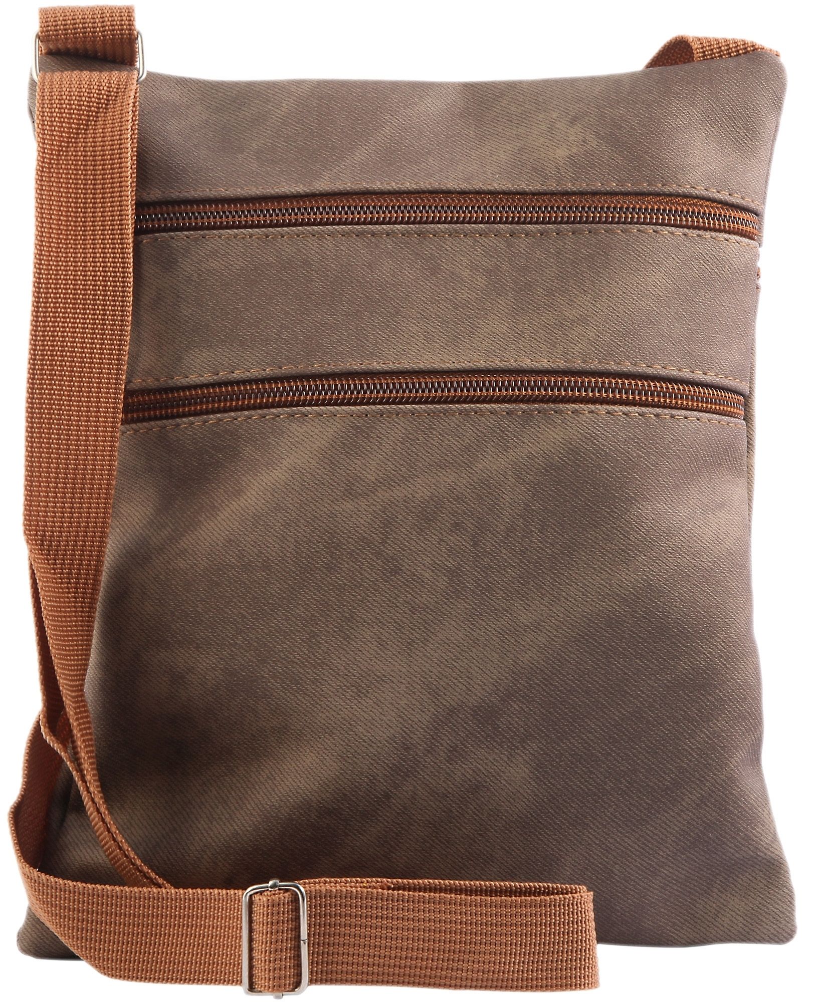 De moderne crossbodytas is gemaakt van robuust kunstleer en heeft een licht gestructureerd oppervlak. Hij heeft ook een lang draaghengsel dat kan worden uitgeschoven tot een maximale lengte van ca. 150 cm. De twee buitenvakken en het vak aan de achterkant zijn toegankelijk met een rits. Deze stijlvolle tas is een modieuze allrounder die voor veel gelegenheden gedragen kan worden. Bovendien is niet alleen het ontwerp indrukwekkend, maar ook de mogelijkheid om al je belangrijke spullen in op te bergen. Of het nu gaat om een rustige wandeling, winkelen of een uitstapje - deze handtas is de ideale metgezel gemaakt van robuuste materialen. De ongevulde tas is 24,5 cm lang, 20 cm breed en 2 cm dik.