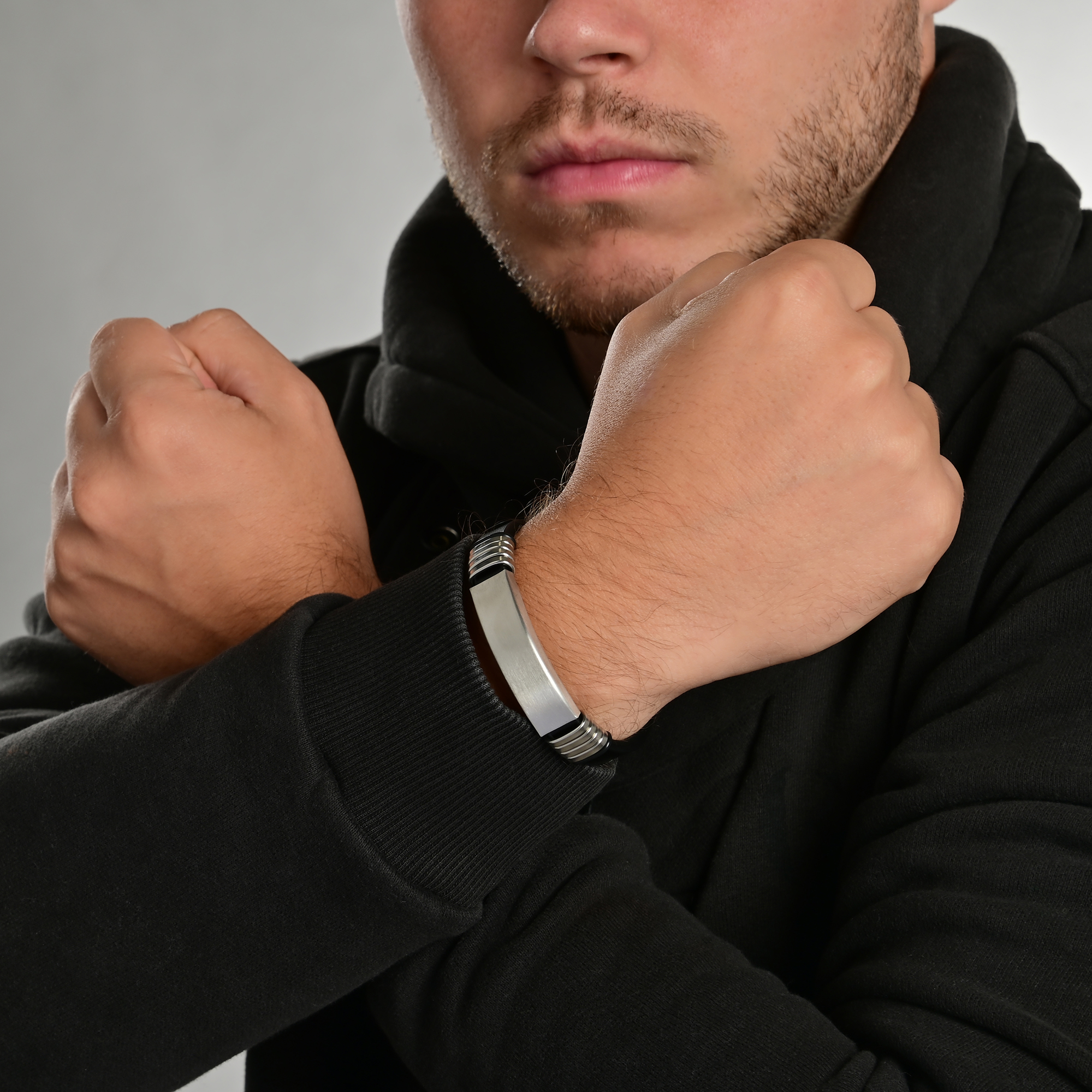 In het midden van de armband zit een zilverkleurig, mat roestvrijstalen graveerplaatje(41 cm lang, 12 mm breed), dat ideaal is voor persoonlijke gravures zoals namen, een speciale datum, enz.