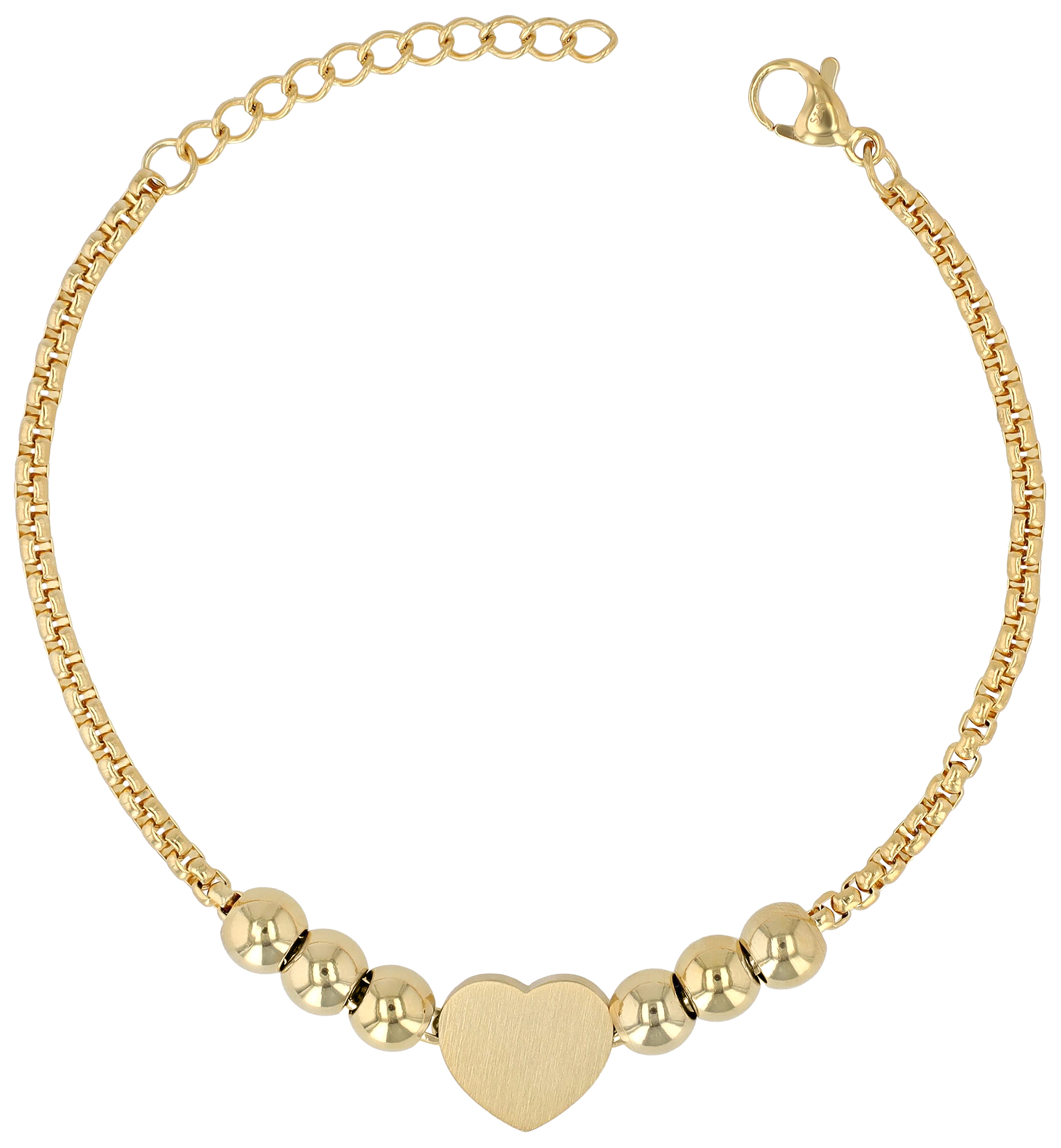 Deze betoverende sieradenarmband van het merk Akzent is gemaakt van roestvrij staal en is verkrijgbaar in zilver- of goudkleur. In het midden van de armband is een mat hart bevestigd met drie gepolijste roestvrijstalen bollen rechts en links van het hartelement. Het hart biedt voldoende ruimte voor kleine gravures.